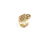 Anello in oro giallo 18kt dal design architettonico. La parte superiore presenta due elementi circolari contrapposti, uniti da una fascia centrale a gradoni affiancata da una barra rettangolare impreziosita da quattro diamanti taglio brillante per ct 0.28 ca