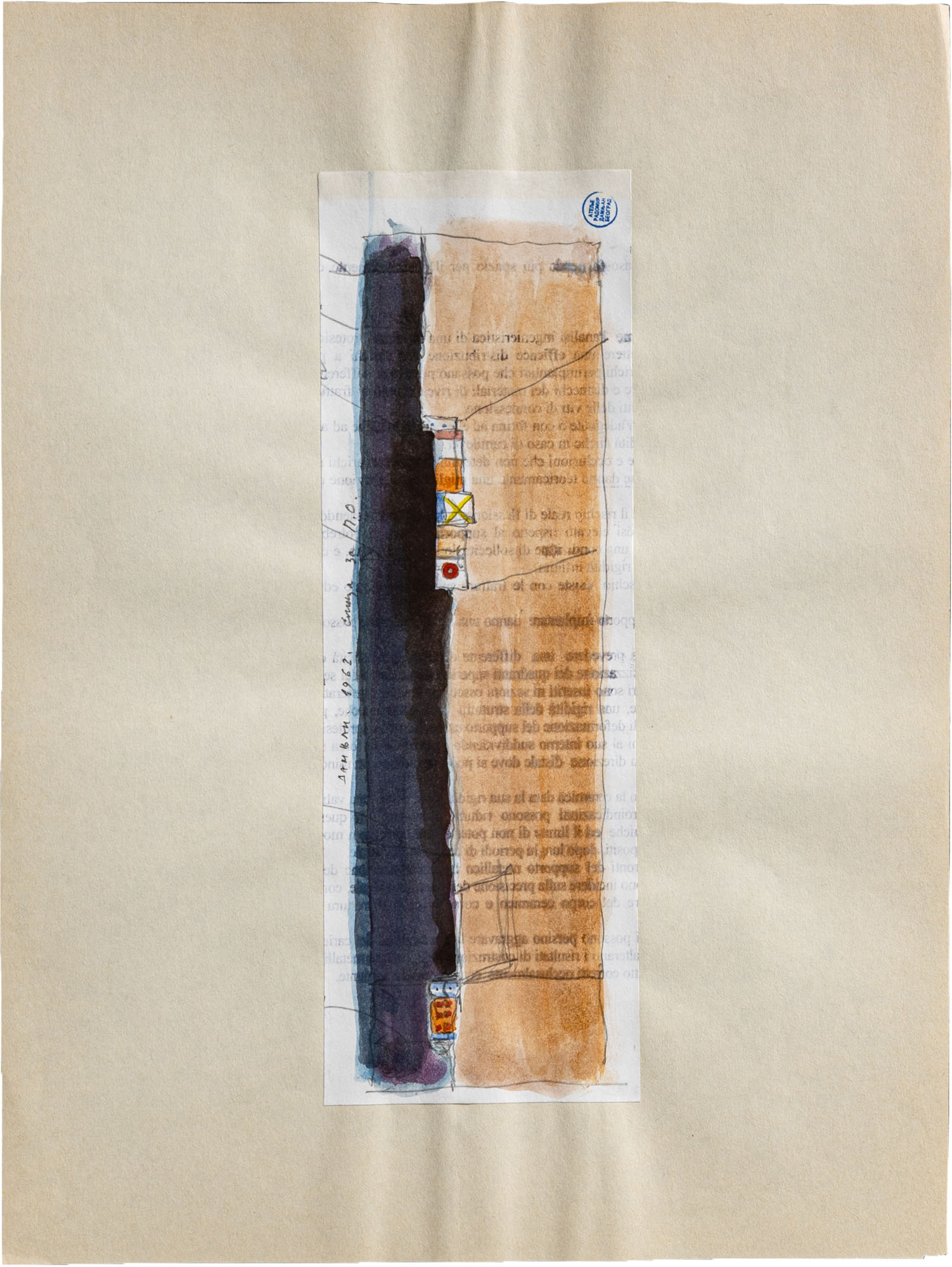 Matita e acquerello su carta stampata applicata su cartoncino