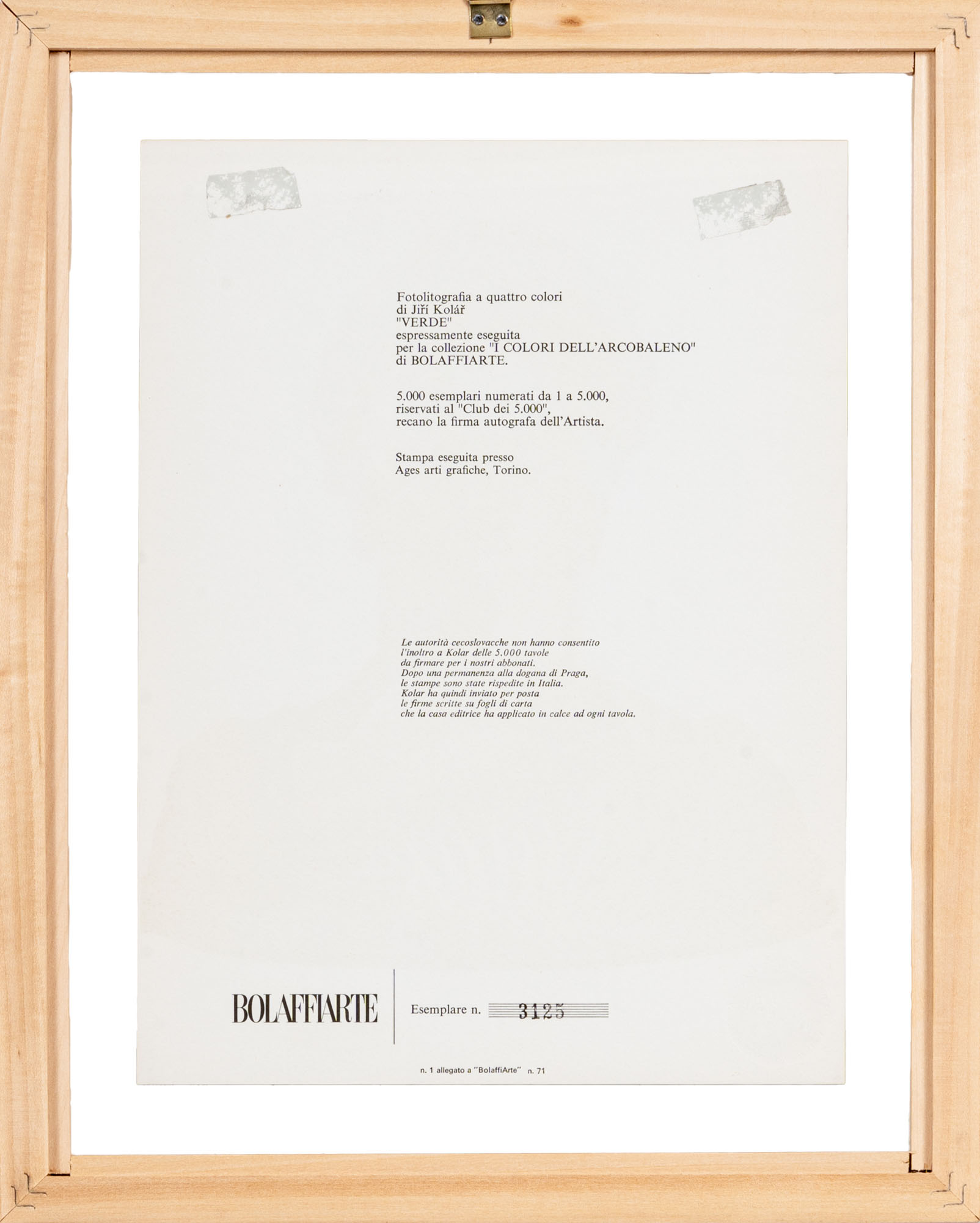 Fotolitografia a quattro colori, es. 3125/5000, su una tiratura complessiva di 5000 esemplari numerati da 1 a 5000, eseguita per la collezione I colori dell'arcobaleno di BolaffiArte, Torino