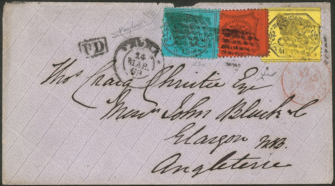 Antichi Stati Italiani - Stato pontificio - Affrancature tricolore per la Scozia su bustina da Roma 24 MAR.69