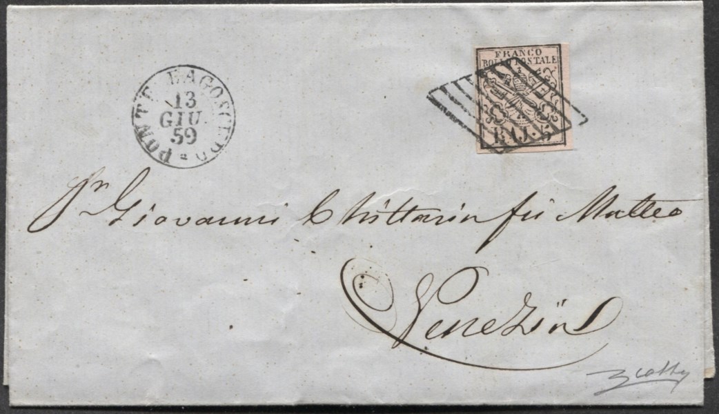Fresca lettera da Pontelagoscuro 13.6.59 per Venezia affrancata con 5 baj bene marginato - secondo giorno d'uso del Pontificio in Governo Provvisorio delle Romagne - cert. Colla - (6)