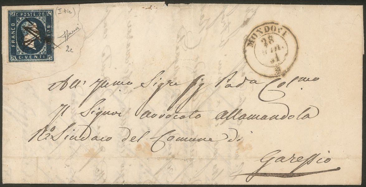 Lettera affrancata con 20 cent azzurro scuro I tiratura (2c) annullato a tratti di penna con a destra annullo Mondovi 28 MAR.51 (p.ti R1) per Garessio - gli annulli a rombi verranno forniti dal maggio 1851 - molto raro - cert. Sorani