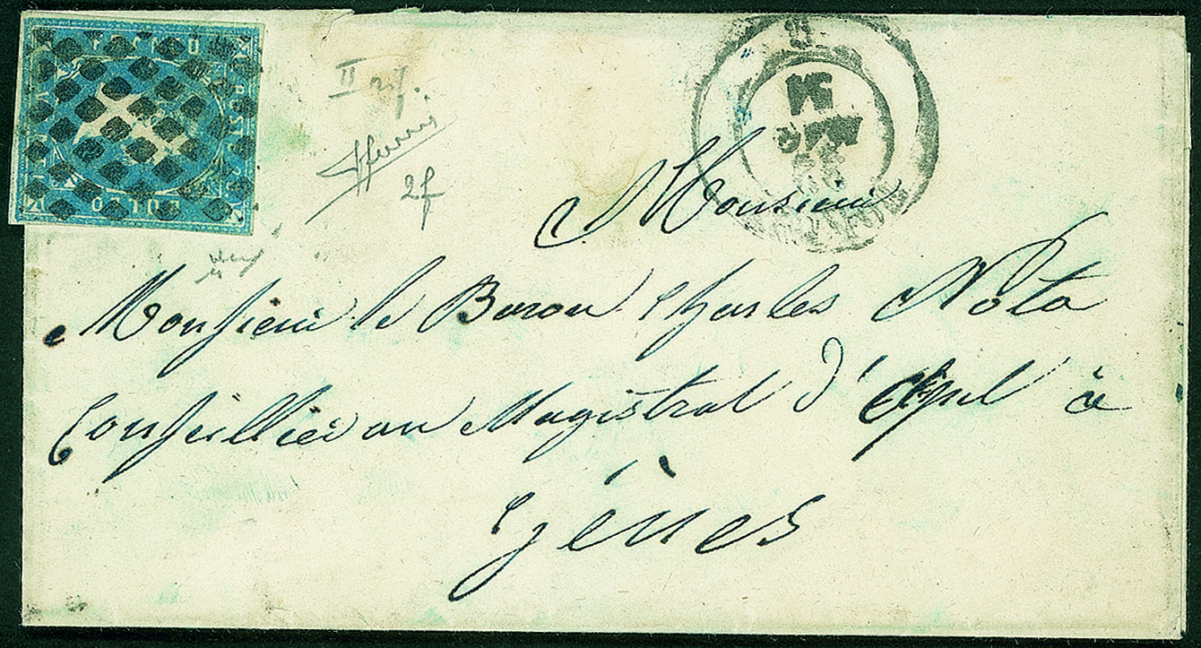 Antichi Stati Italiani - Sardegna - Piccola lettera affrancata con 20 cent azzurro chiaro da Torino 22 MAG.51 per Genova