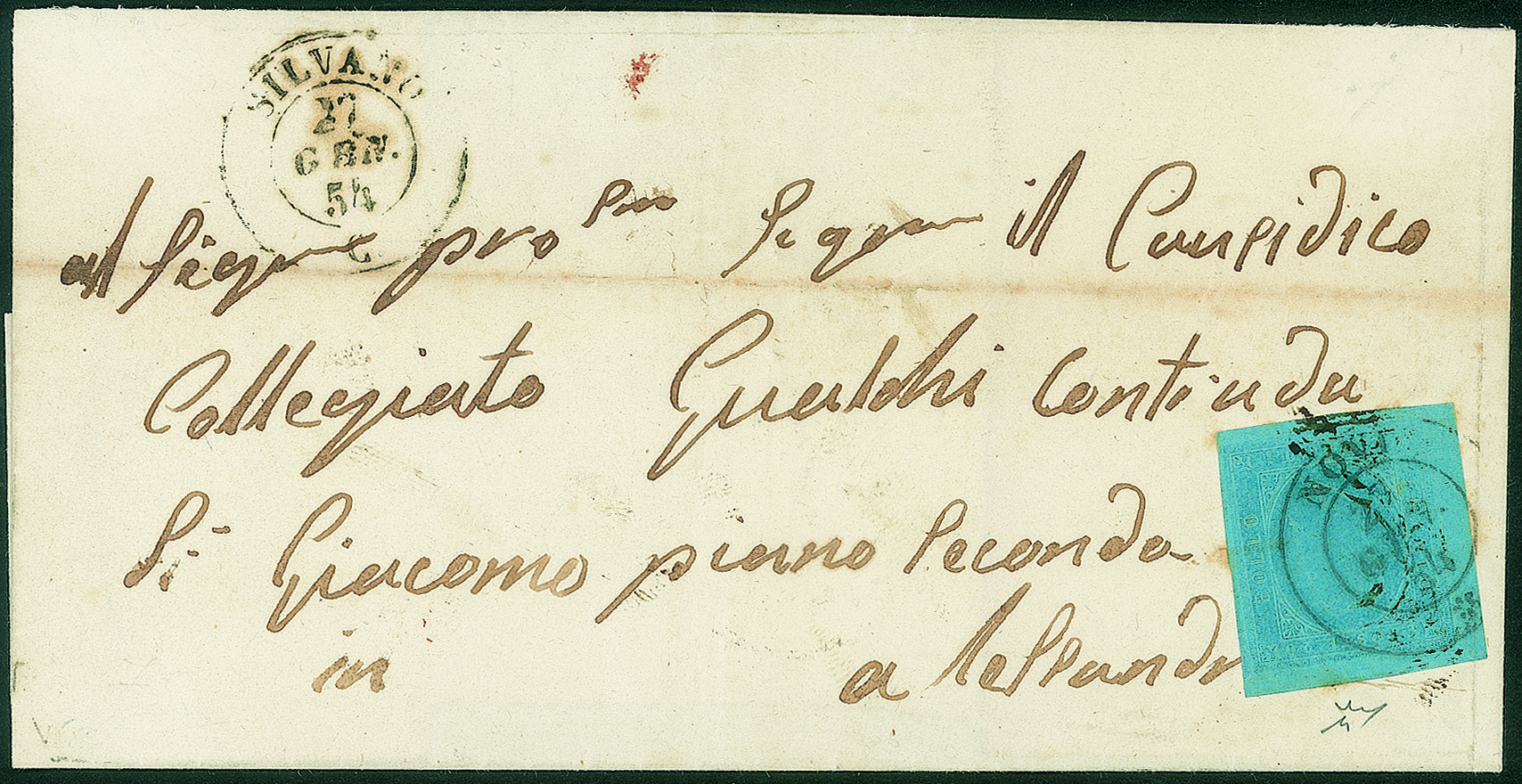 Lettera da Silvano/c 27 GEN.54 per Alessandria affrancata con 20 cent azzurro seconda emissione (5) annullato in transito a Novi - non ci risultano note altre lettere da Silvano affrancate con questa emissione - firma Chiavarello