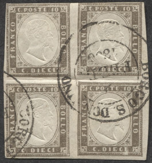 Blocco di quattro del 10 cent grigio brunastro - Borgo S. Donnino - PROBABILMENTE UNICO - Em.D + Oliva + ED + cert. Raubaudi - (14Ae)