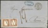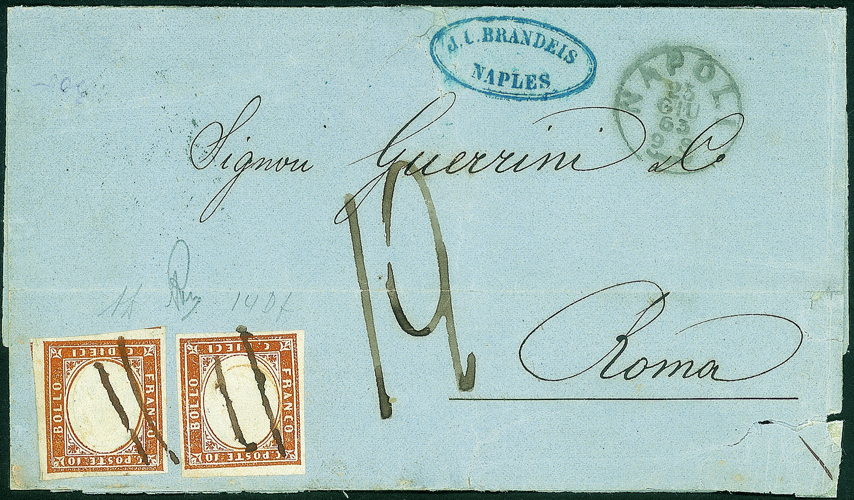 Annullati a penna su lettera da Napoli 23 GIU.63 per Roma con tassa pontificia di 12 bajocchi - al verso annullo dell'ambulante Napoli-Isoletta - firma AD