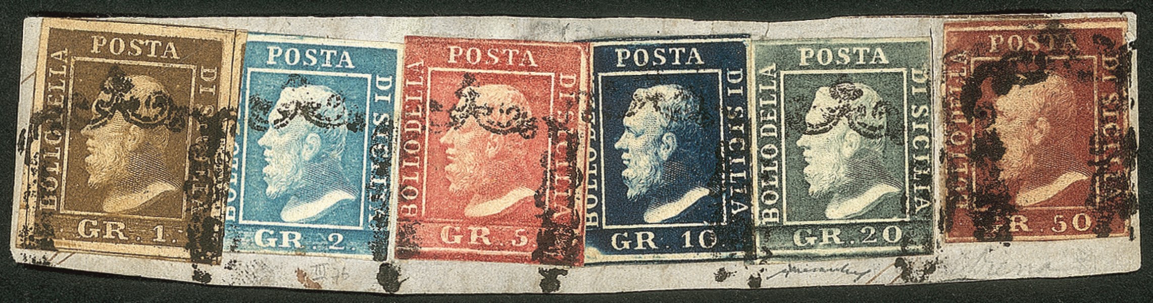 Antichi Stati Italiani - Sicilia - Frammento con affrancatura esacolore (3a + 8 + 9 + 12 + 13 + 14)
