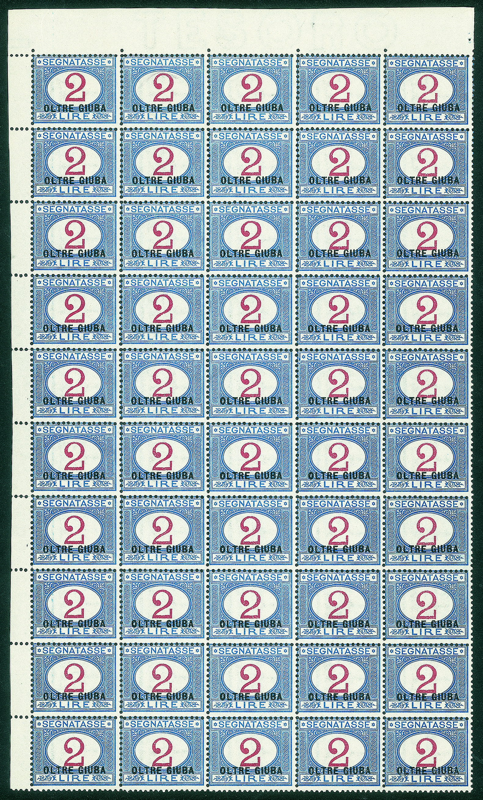 2 lire segnatasse soprastampati (9) - blocco di 50 esemplari angolo di foglio alto a sinistra - gomma integra