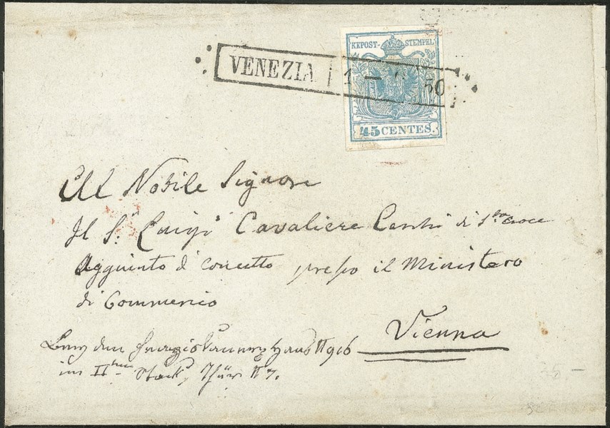 Lettera da Venezia (R50 P.ti 5) del 1.9.1850 per Vienna 8Austria) affrancata con 45 cent primo tipo prima tiratura (10a)