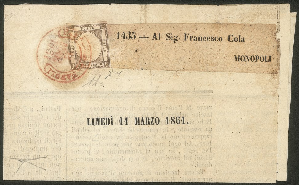 Perfetto - isolato su fascetta con testata del giornale Il nazionale da Napoli 11 MAR 1861 a Monopoli - prima data finora nota del 1/2 grano che anticipa quella del catalogo Sassone - rarità del settore - cert. Bottacchi