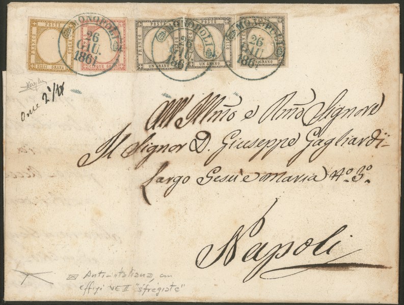 Con 1 grano grigio scuro tre esemplari + 5 grana rosa + 10 grana giallo ocra (19a + 21e + 22a) da Monopoli 26 GIU.1861 per Napoli - Dal certificato Bottacchi: ai francobolli, in sfregio alla figura del monarca sabaudo (poco tollerato dai cittadini filo-borbonici), fu all'epoca grattata mediante apposita abrasione la barba delle effigi a rilievo che risultano così vilipese co chiaro intento anti-Sabaudo
