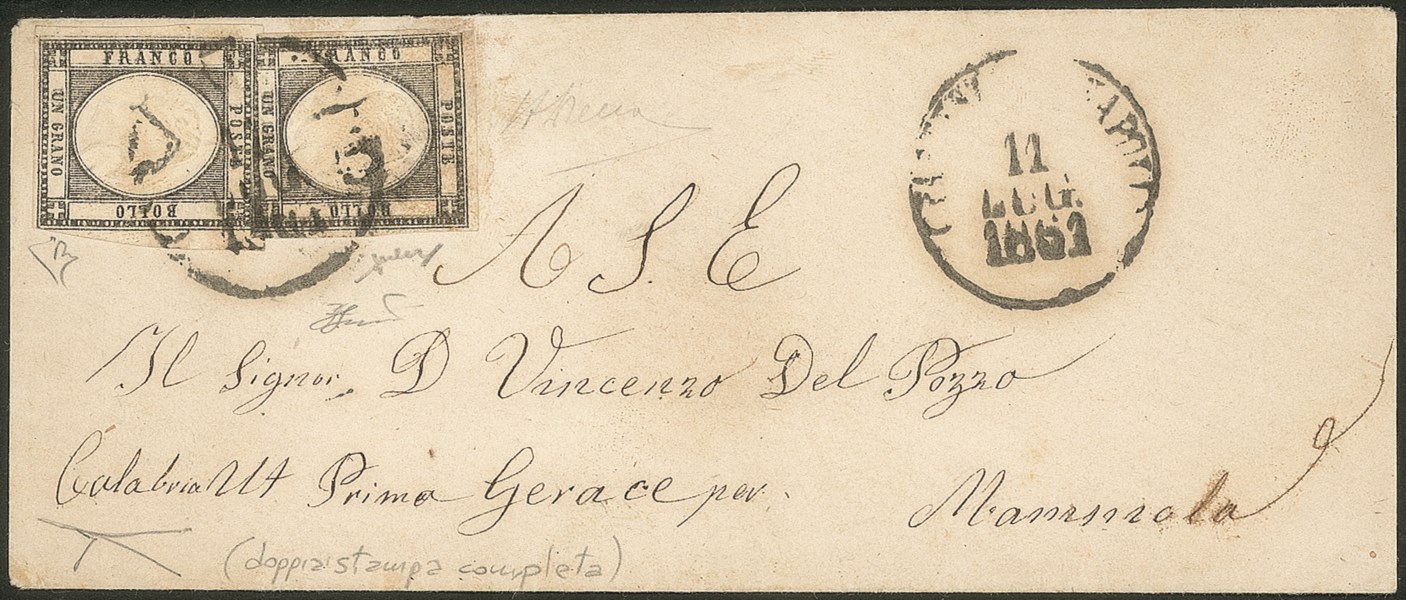 Bustina affrancata con due esemplari del 1 grano nero con doppia stampa (19cgc) uno con doppia impressione parziale l'altro con doppia impressione completa da Napoli 11 LUG.1861 a Mammola - sul catalogo sassone è citato un solo valore usato con doppia stampa parziale - eccezionale oggetto iconico per le varietà delle province napoletane - cert. Bottacchi