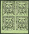 Quartina del 5 cent verde oliva (8a cat.21000) - angolo di foglio - doppia stampa con primo esemplare senza punto dopo cent - gomma originale nella coppia superiore e integra in quella inferiore - fresca e splendida - firma ED