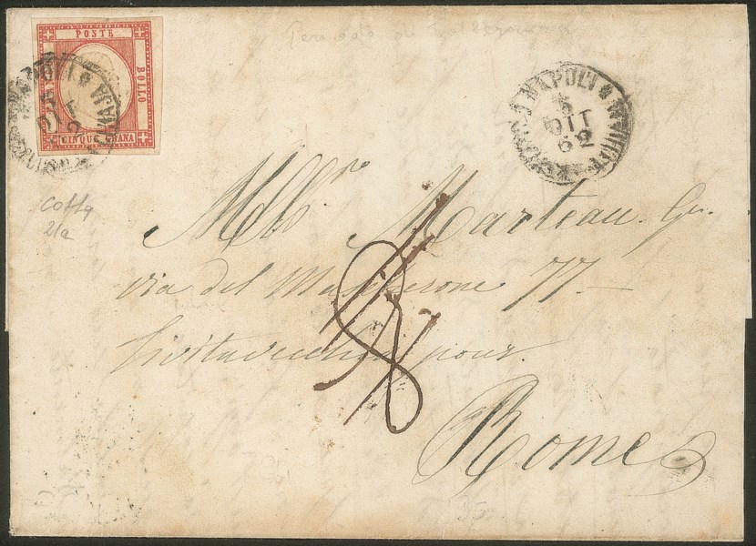 Da Napoli succursale a Chiaia 5 OTT 62 (21a P.ti7 cat.1575) per Roma con tassa 8 manoscritta - periodo tolleranza - firma Colla