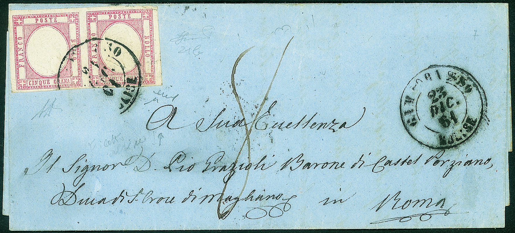 Da Campobasso 23 DIC.61 per Roma con tassa 8 baj per l'inoltro a destino - firme Chiavarello + AD