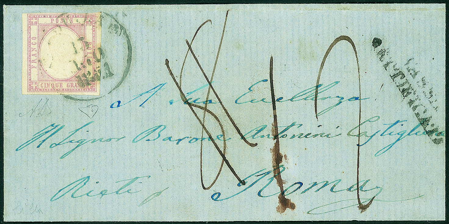 Su sovracoperta di lettera da L'Aquila 13.8.1861 per Roma - tassata per 8 bajocchi poi cassati e corretti in 12 con l'apposizione del lineare tassa rettificata di Roma in nero - interessante - Firma A. + E. Diena