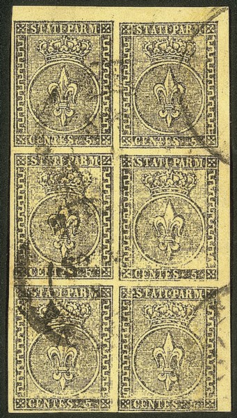 Antichi Stati Italiani - Parma - 1852 - Blocco di sei usato del 5 cent verdino (1b)