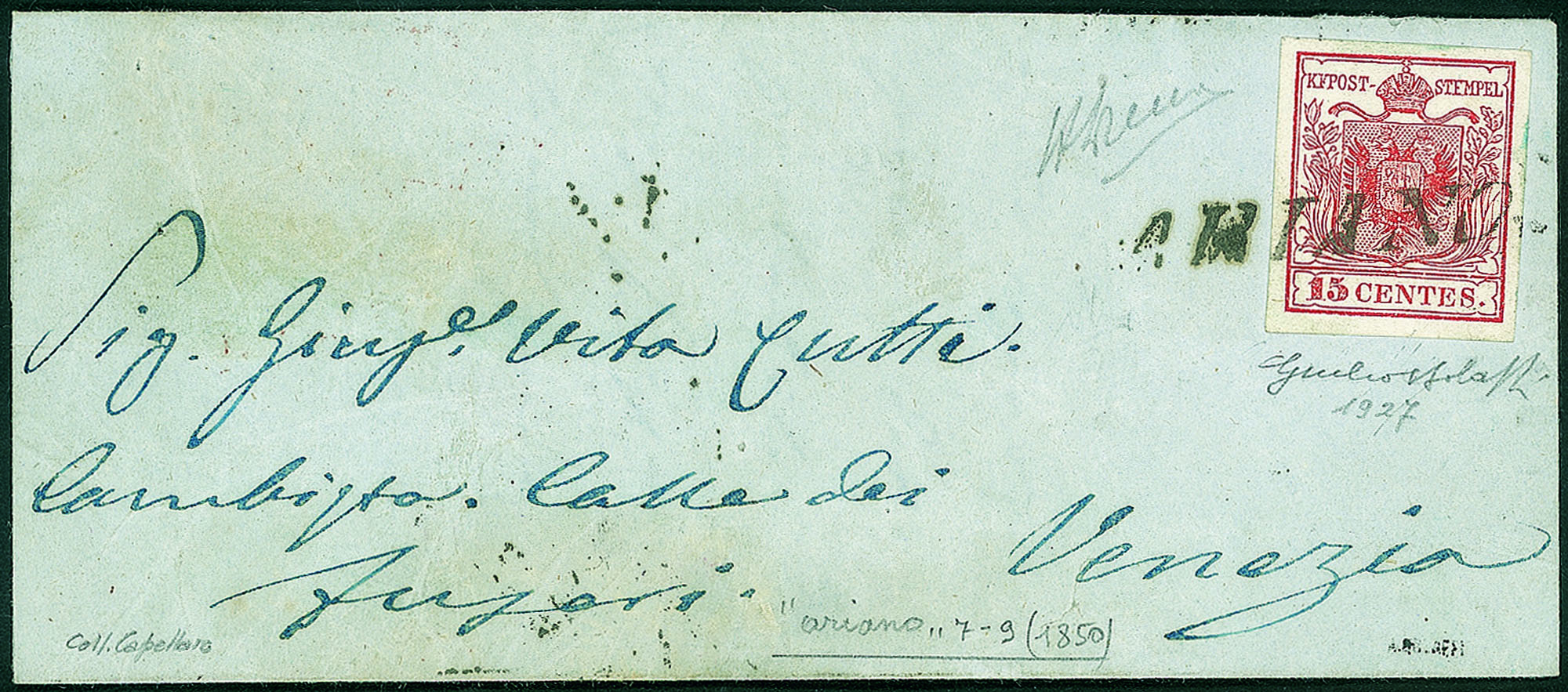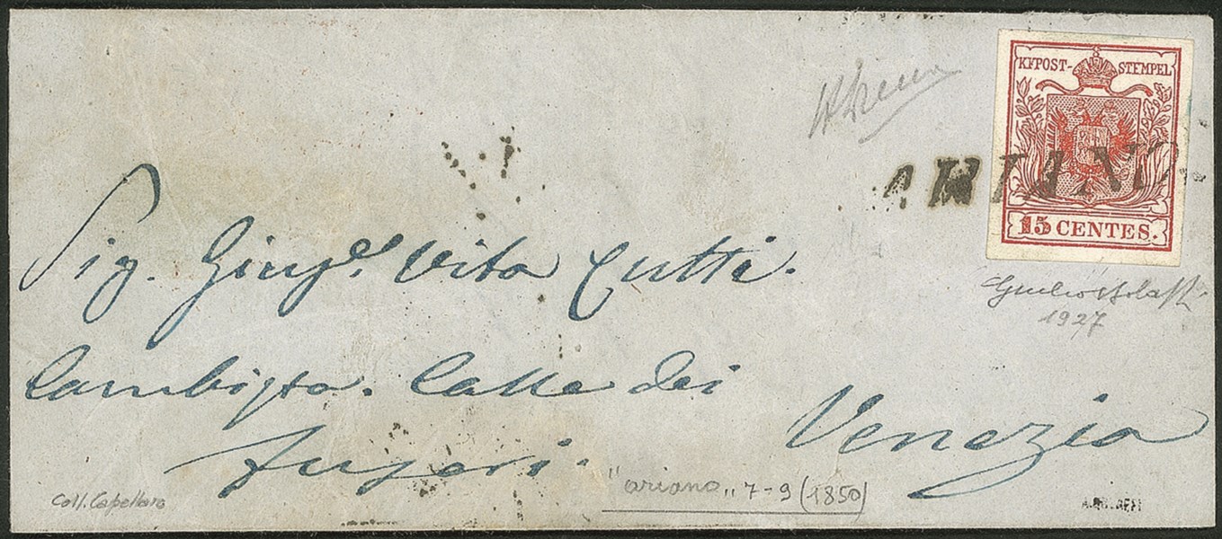 Su lettera del 7.9.1850 per Venezia affrancata con 15 cent (3a) carta a mano primo tipo prima tiratura - firma A. Diena + cert. Bolaffi