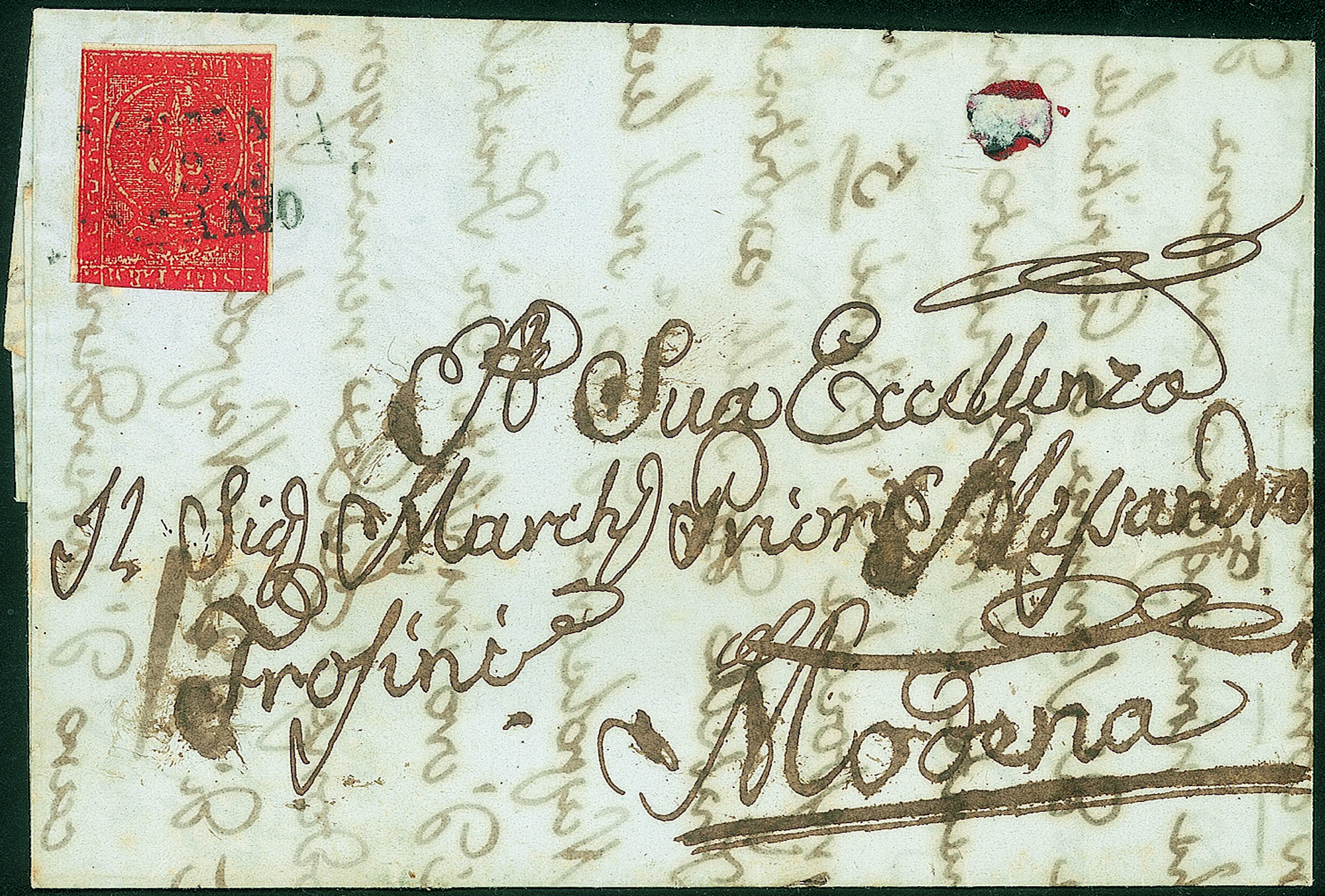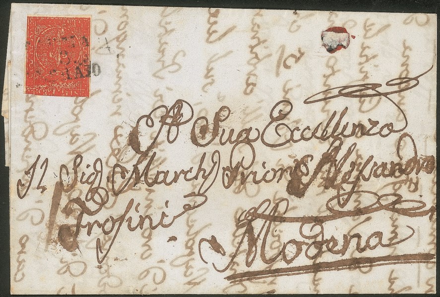Senza la cifra del valore e molto inchiostrato diretta a Modena - corto in alto ma comunque d'effetto