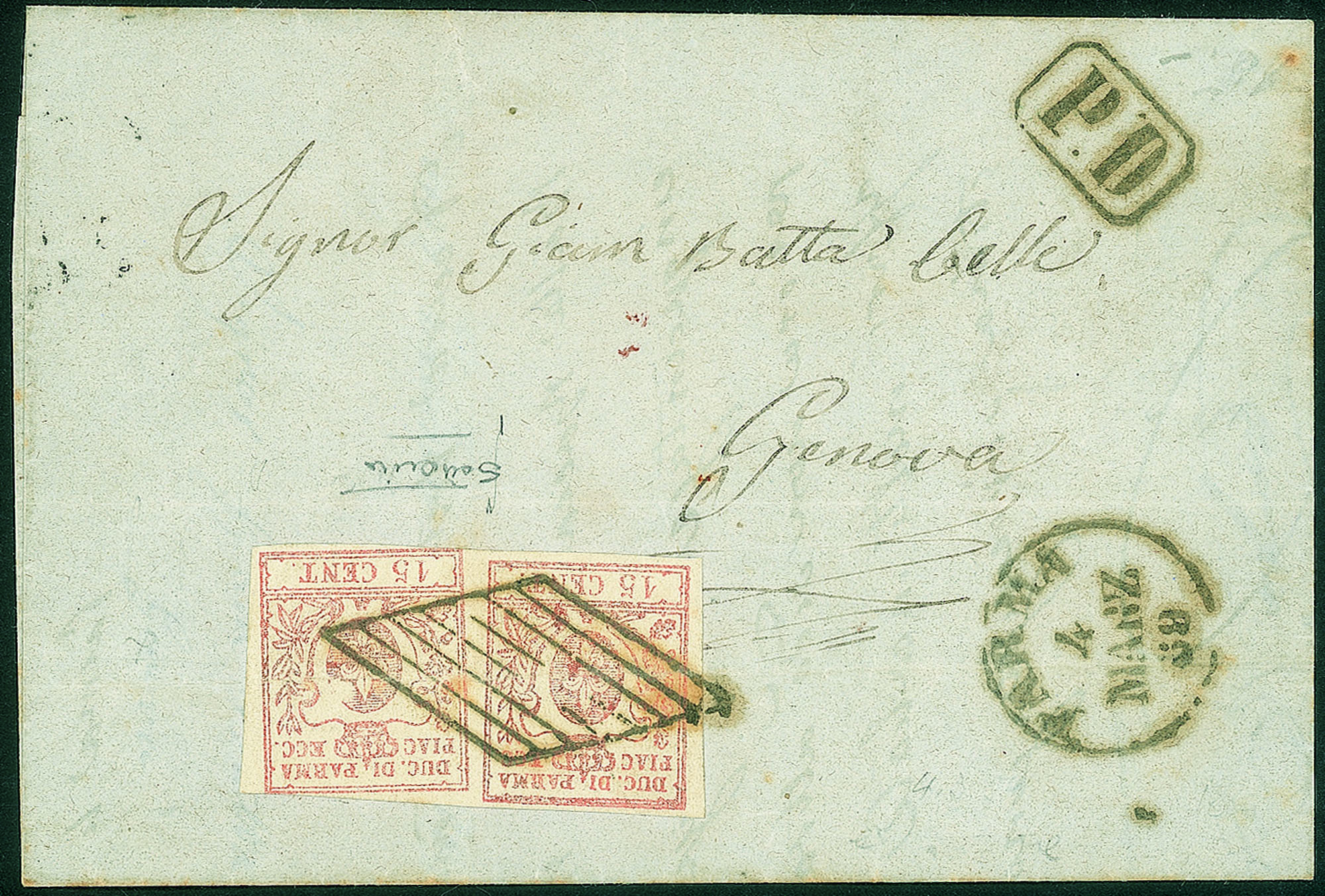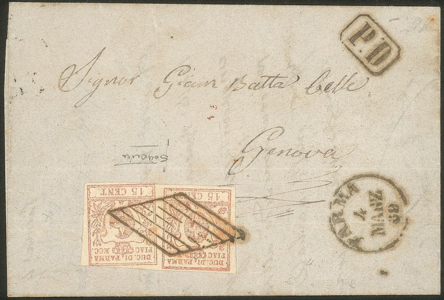 Antichi Stati Italiani - Parma - Lettera da Parma 4 Marzo 59 per Genova con coppia 15 cent vermiglio (9)