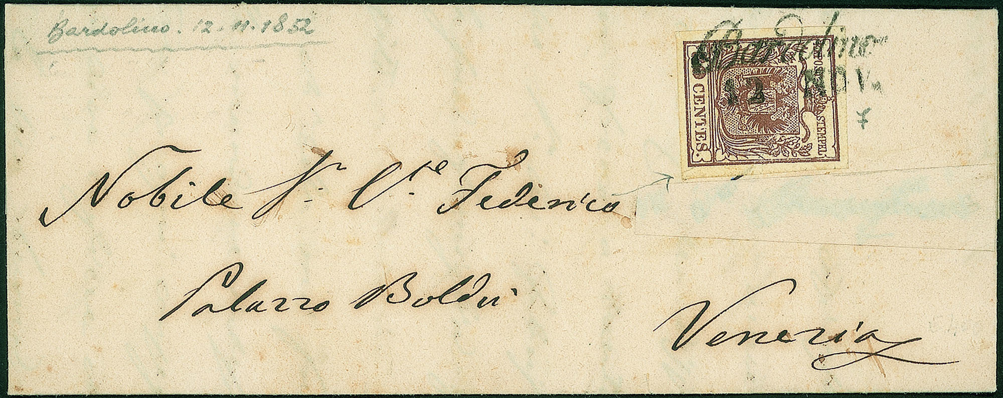 Su lettera del 5.11.1852 per Legnago affrancata con 15 cent