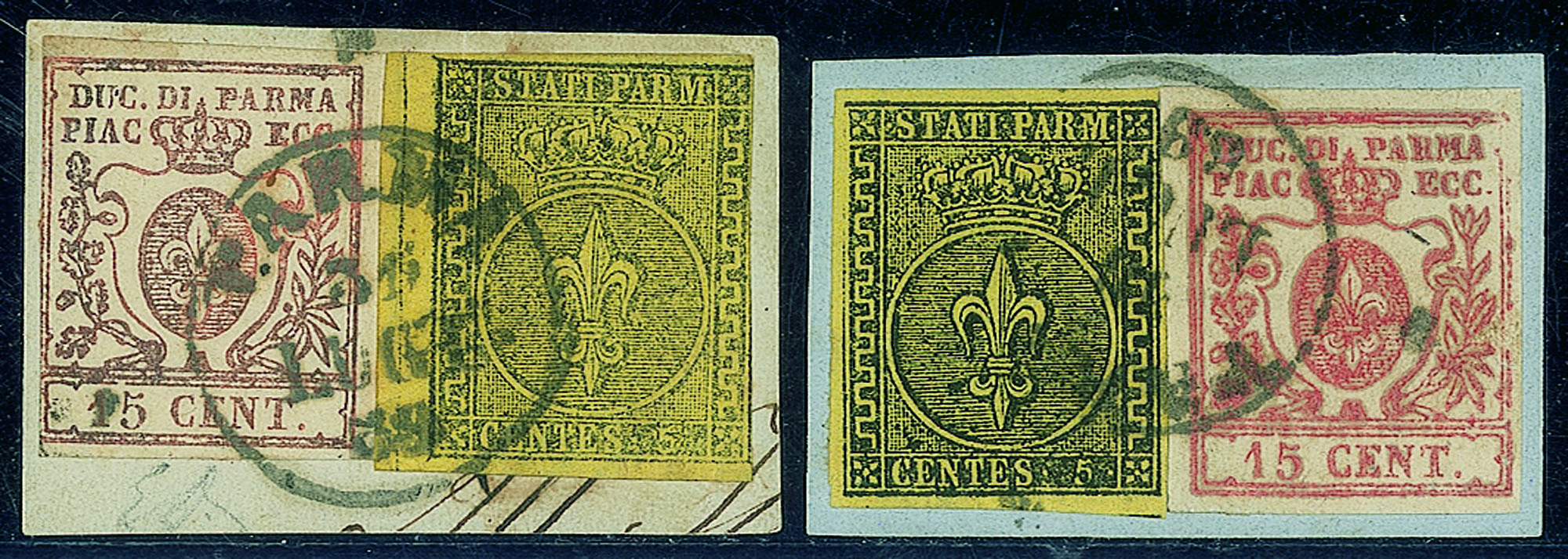 Antichi Stati Italiani - Parma - Miste di Emissioni diverse - 1859 - Lotto di due frammenti con il 5 cent e il 15 cent (1 + 9)