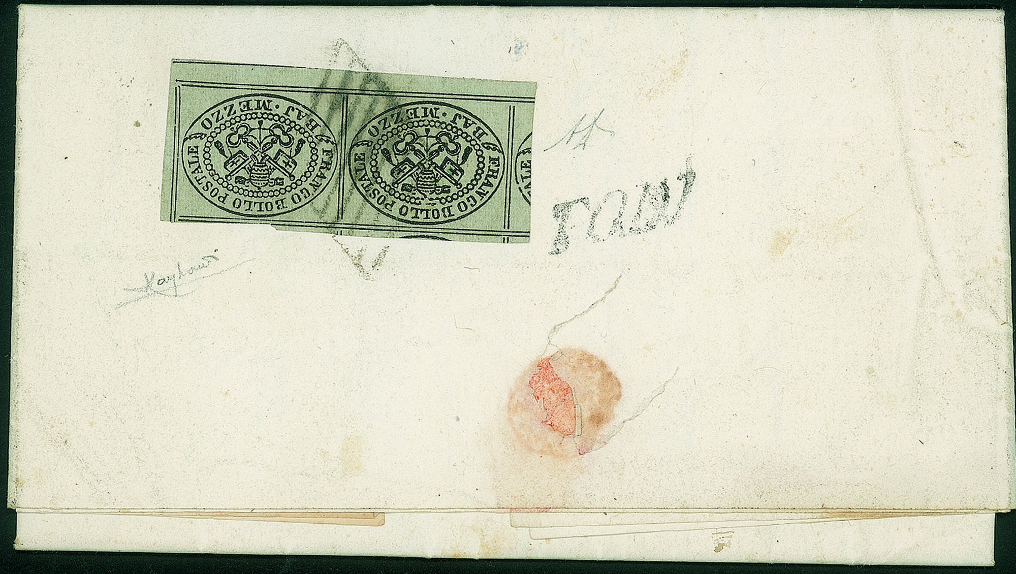 Affrancata al retro con bella coppia del 1/2 baj (1) con 8 filetti e interspazio di gruppo inferiore e annullata con griglia da Todi per Marciano del 10.1.59 - molto bella e fresca - Raybaudi + A. Diena