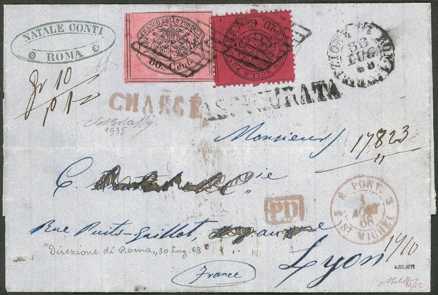 Annullati a griglia pontificia + bollo DIREZIONE DI ROMA 30 LUG.68 e lineare ASSICURATA, diretta a Lione - al confine il bollo d'ingresso E.PONT ST.MICHEL 1 AOUT.68, P.D. in cartella rossa e lineare rosso CHARGE' - insieme molto raro - Bolaffi