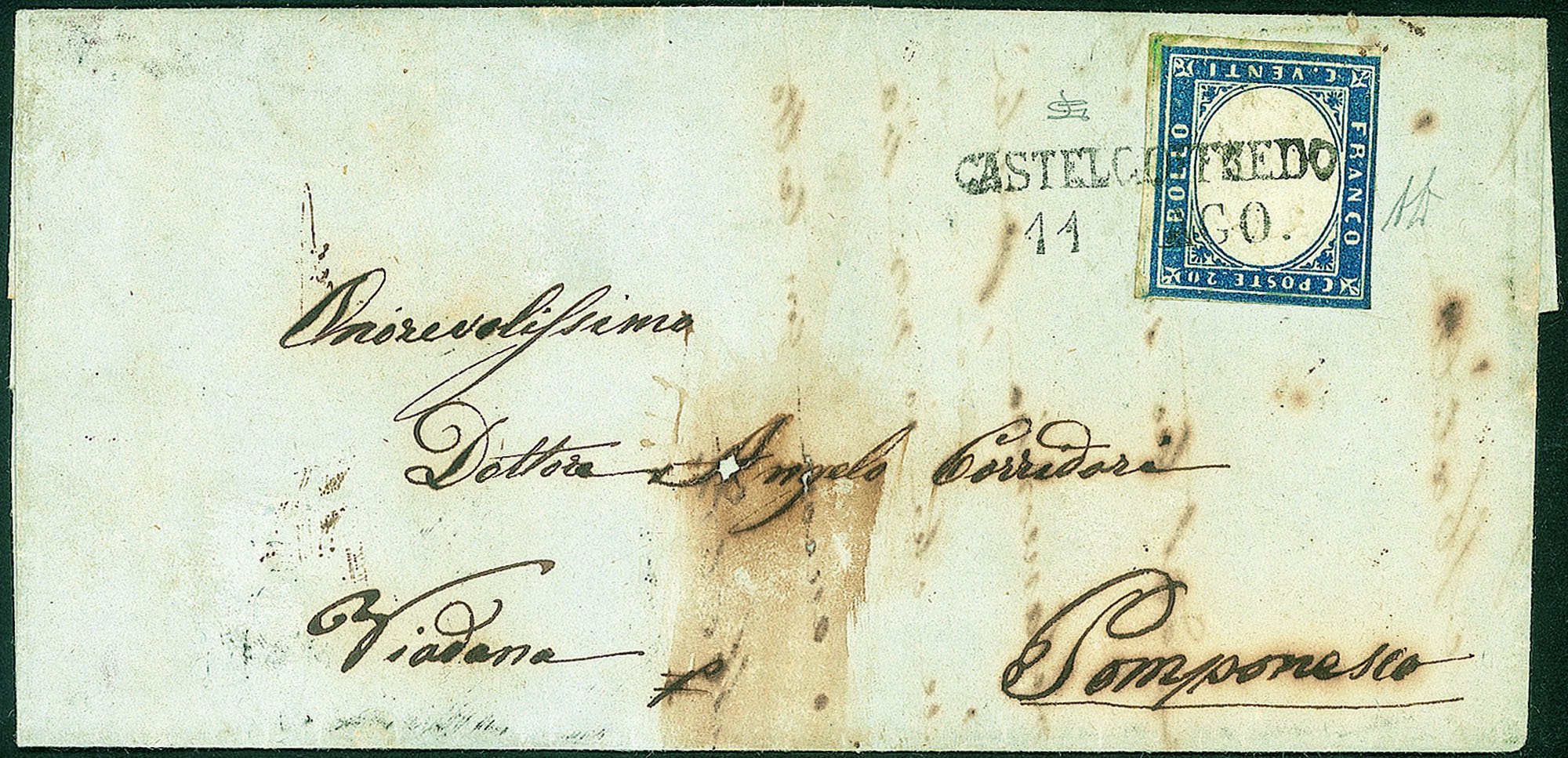 Lettera del 11.8.1860 per Pomponesco affrancata con 20 cent IV di Sardegna (15) - firma A. Diena e L. Gazzi