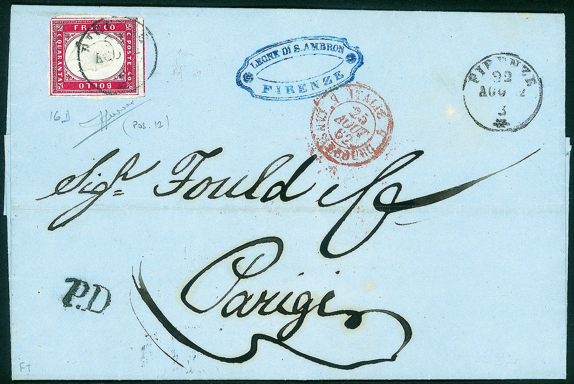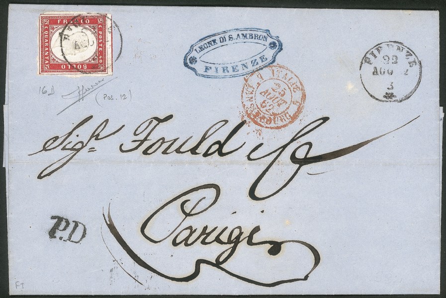 Isolato da Firenze a Parigi del 22.8.62 - grandi margini 4 filetti completi posizione 12 del foglio - splendida - Sorani