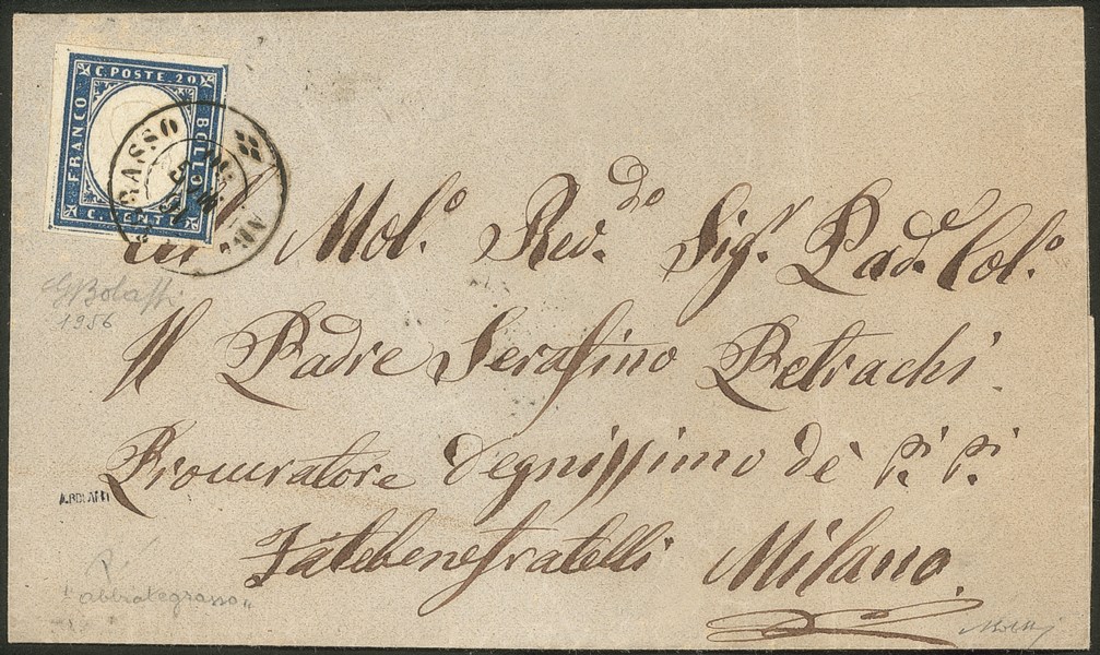 Antichi Stati Italiani - Sardegna - Annullamenti - Fresca lettera con esemplare del 20 cent cobalto grigio (15Cb)