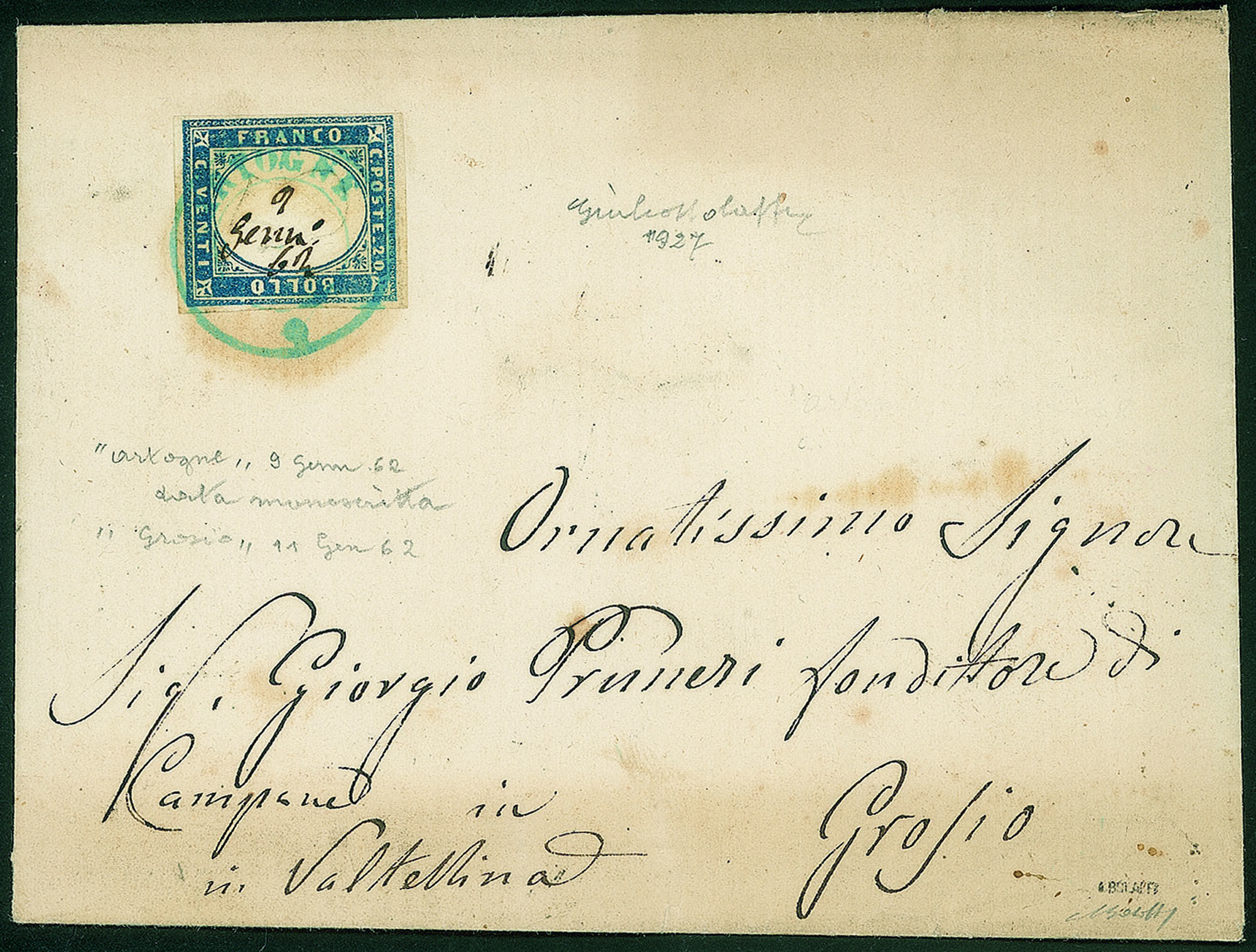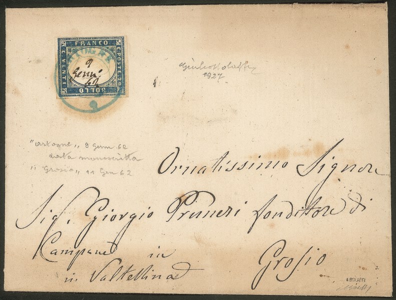 Con data manoscritta - 20 cent indaco (15E) su lettera per Grosio del 9.1.62) - splendida - Giulio Bolaffi