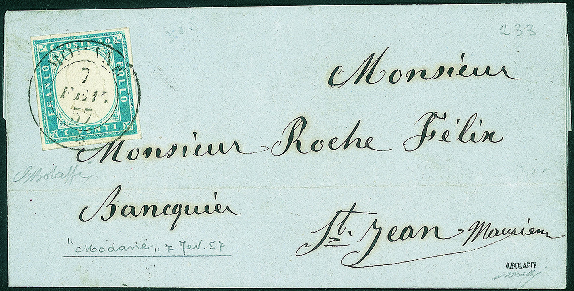 Bell'esemplare del 20 cent celeste (15f) su bustina per St. Jean Marittime del 7.2.57 - molto bella - ex coll. Em. filiberto e Provera - Bolaffi
