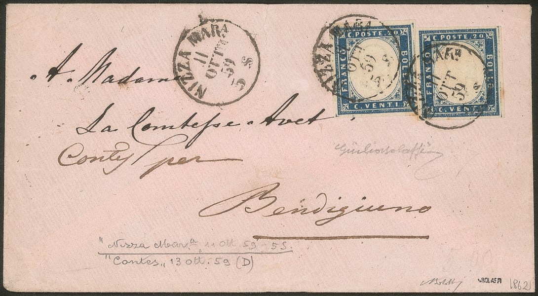 Su bella bustina di colore rosa da Nizza Marittima a Contes del 11.10.59 - fresca e molto bella - Giulio Bolaffi