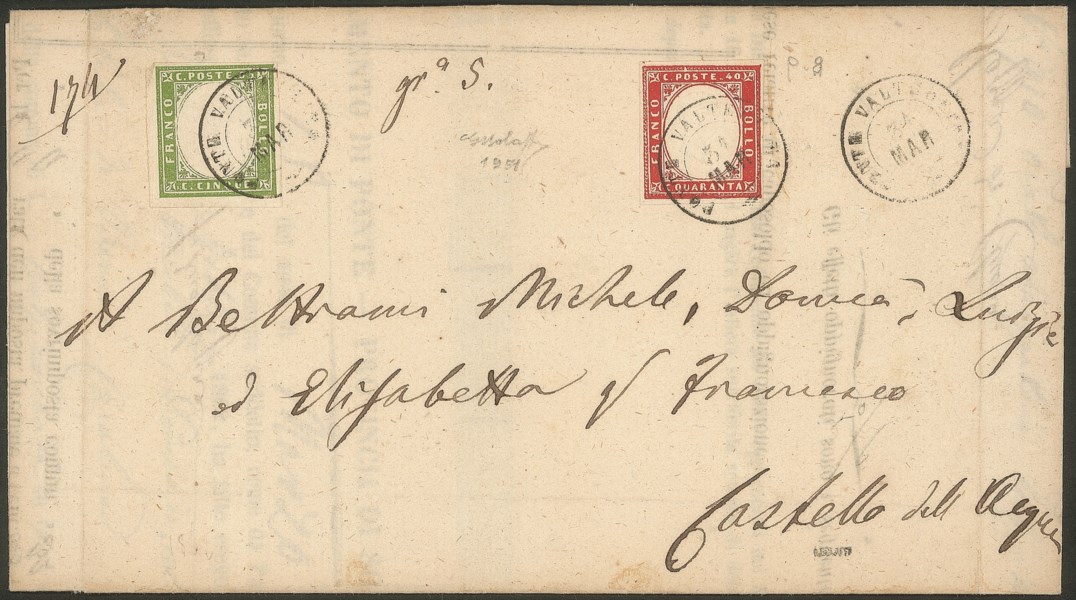 Antichi Stati Italiani - Sardegna - Annullamenti - Mandato di pagamento affrancato con 5 cent + 40 cent (130 + 16E)