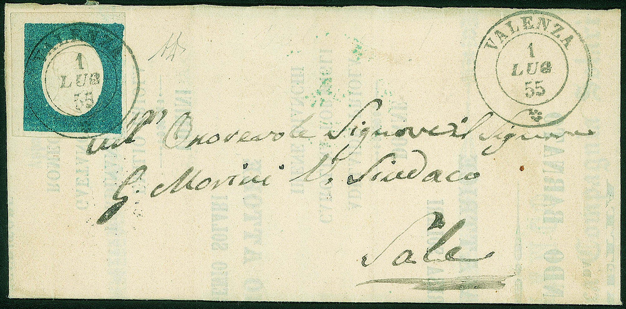 Su letterina in parte stampata da Valenza (P.ti 7) a Sale del 1.7.55 - molto bella - cert. G. Bolaffi