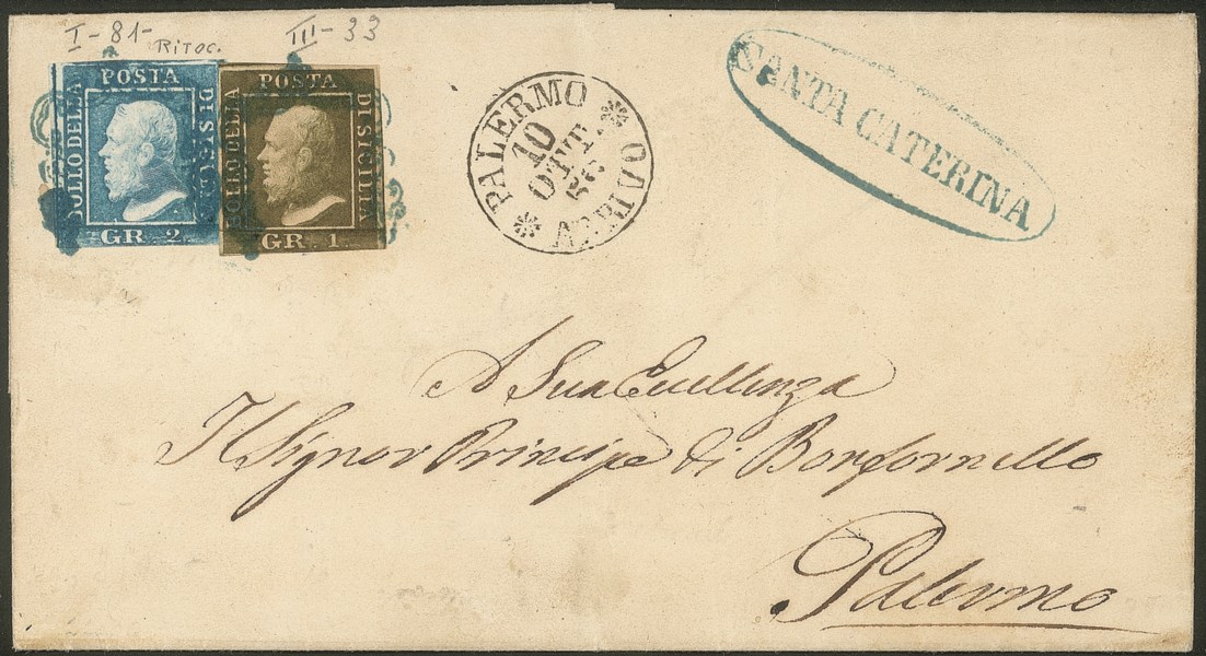 III Tavola pos. 33 e un 2 grana azzurro (6) I Tavola con ritocco 81 da Santa Caterina (ovale azzurro - P.ti 10) a Palermo del 10.10.59 - splendido insieme