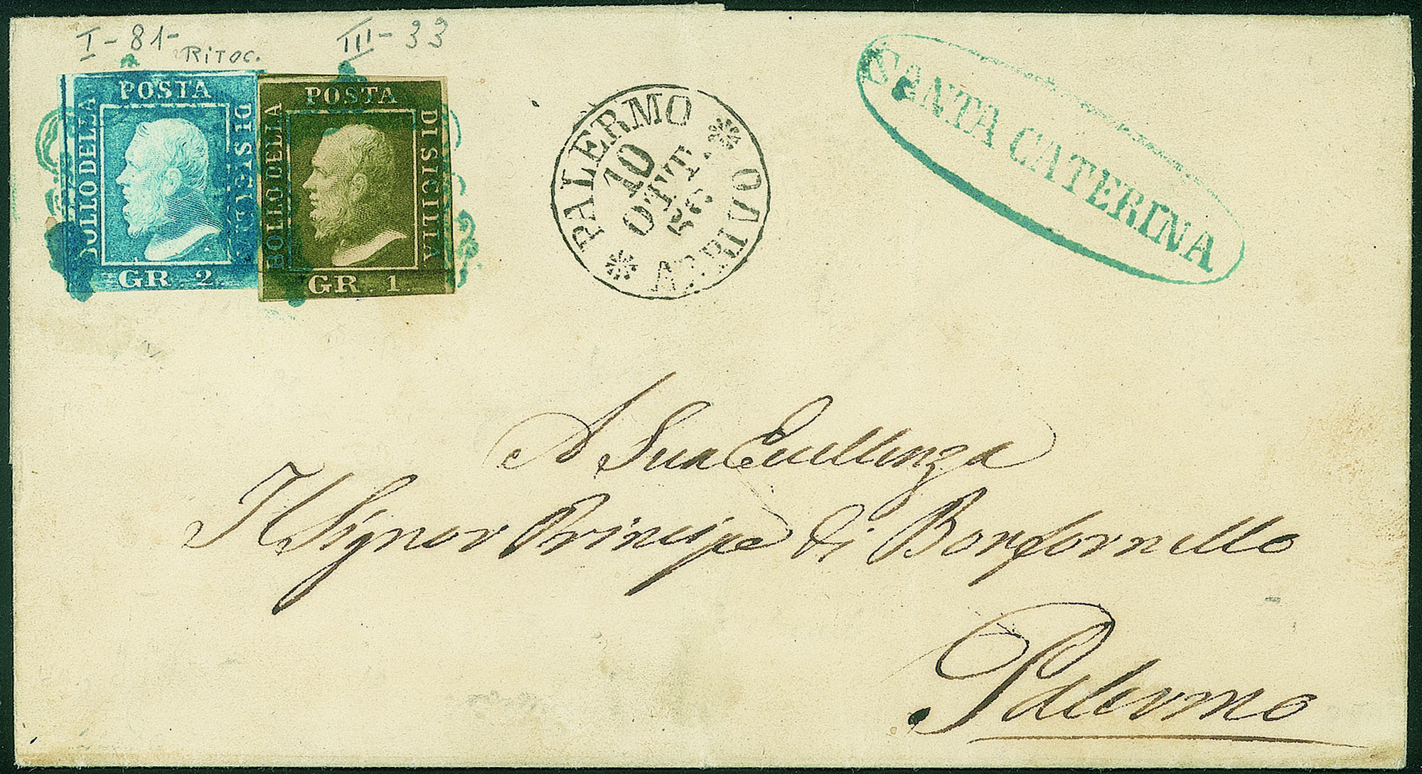 Antichi Stati Italiani - Sicilia - Fresca sovracoperta affrancata con 1 grano verde oliva chiaro (5)