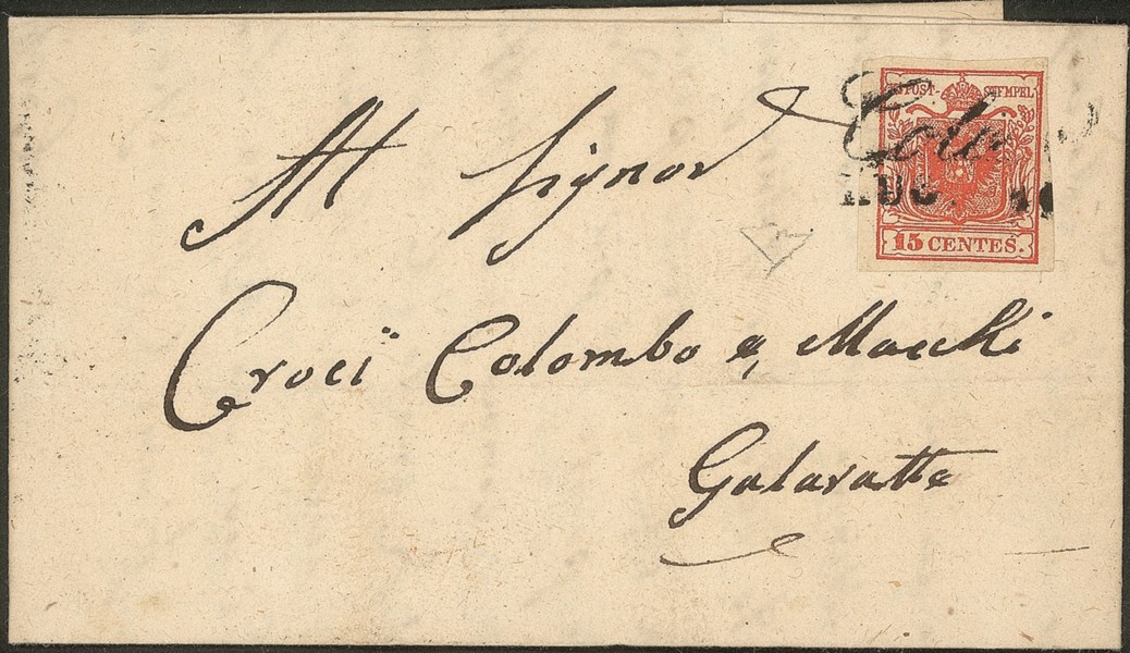 15 cent rosso carminio (3c) su letterina per Gallarate del 11.7.1851 - cert. En. Diena