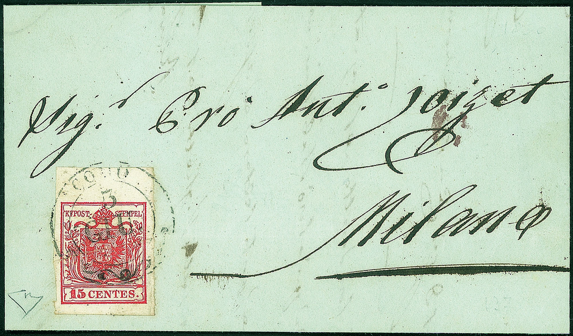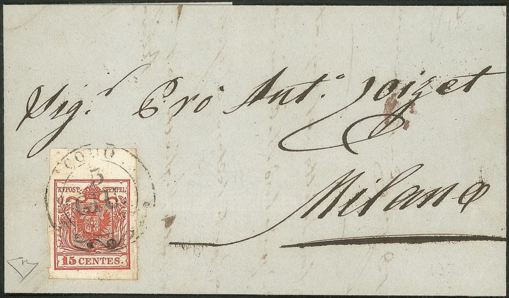 Lettera del 3.6.1850 terzo giorno d'uso per Milano affrancata con 15 cent carta a mano primo tipo prima tiratura bordo di foglio (3a) - cert. E. Diena