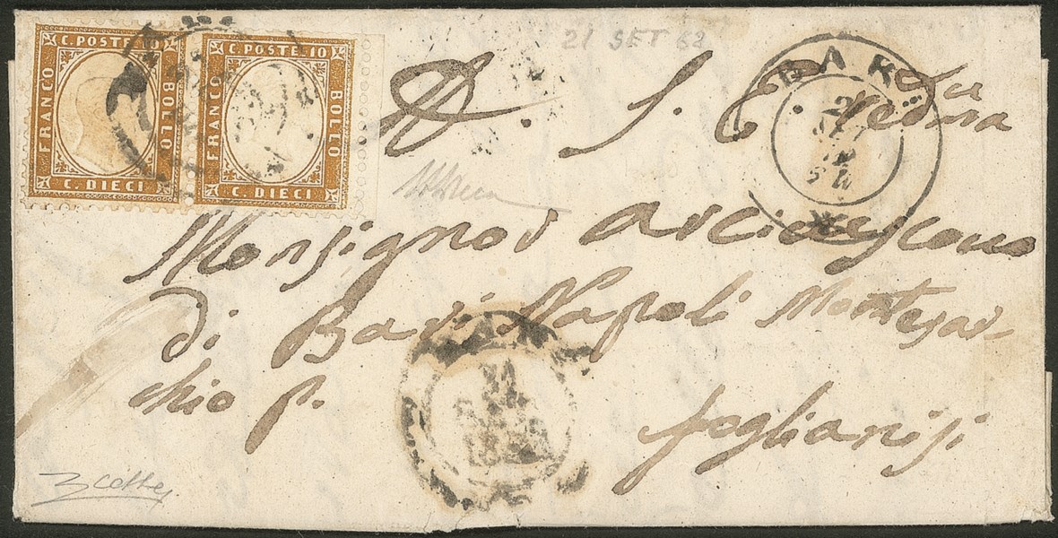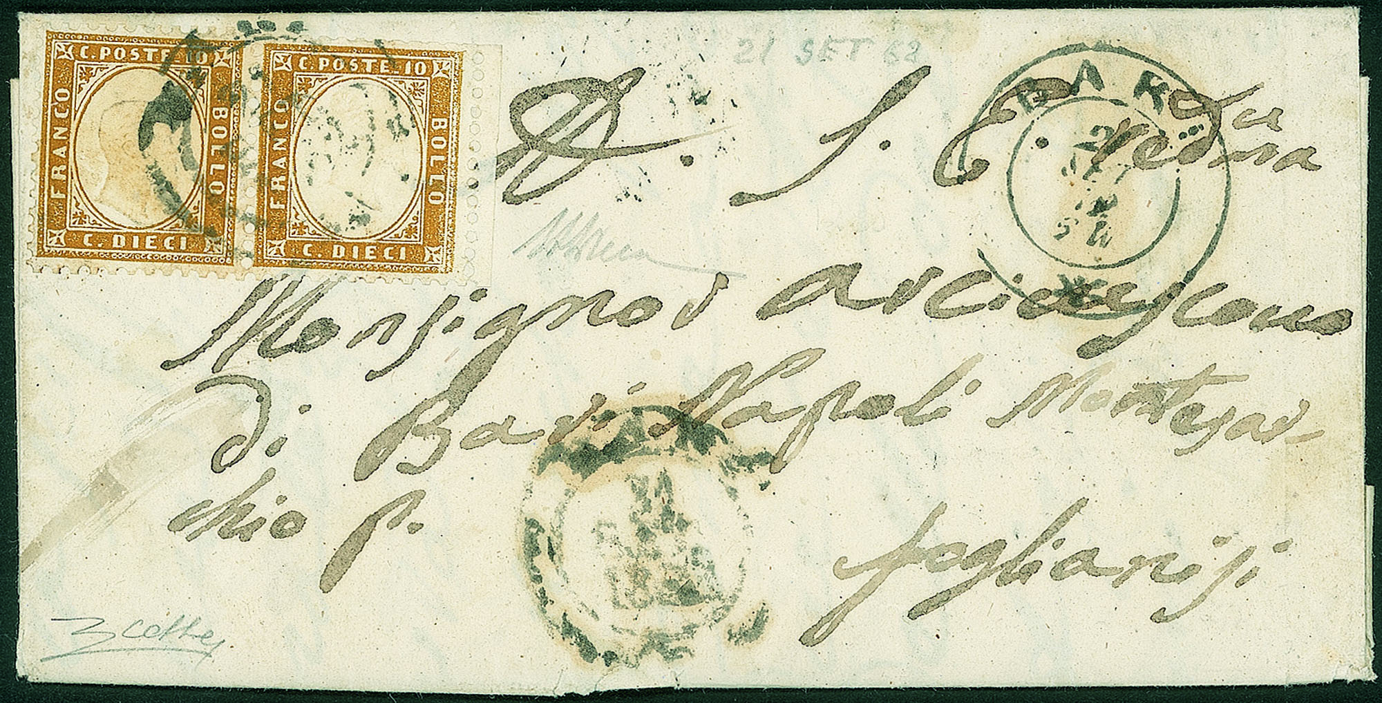 Con 10 cent. dentellato coppia bordo di foglio a destra (Sass. 1) Primissimi giorni d'uso dei francobolli d'Italia nelle Province napoletane che anticipa la data ufficiale del 1° ottobre. Valutata dal Sirotti Colla del 1999 3 milioni di lire (x2 6 milioni pari alle attuali 4700 euro) - cert. Diena