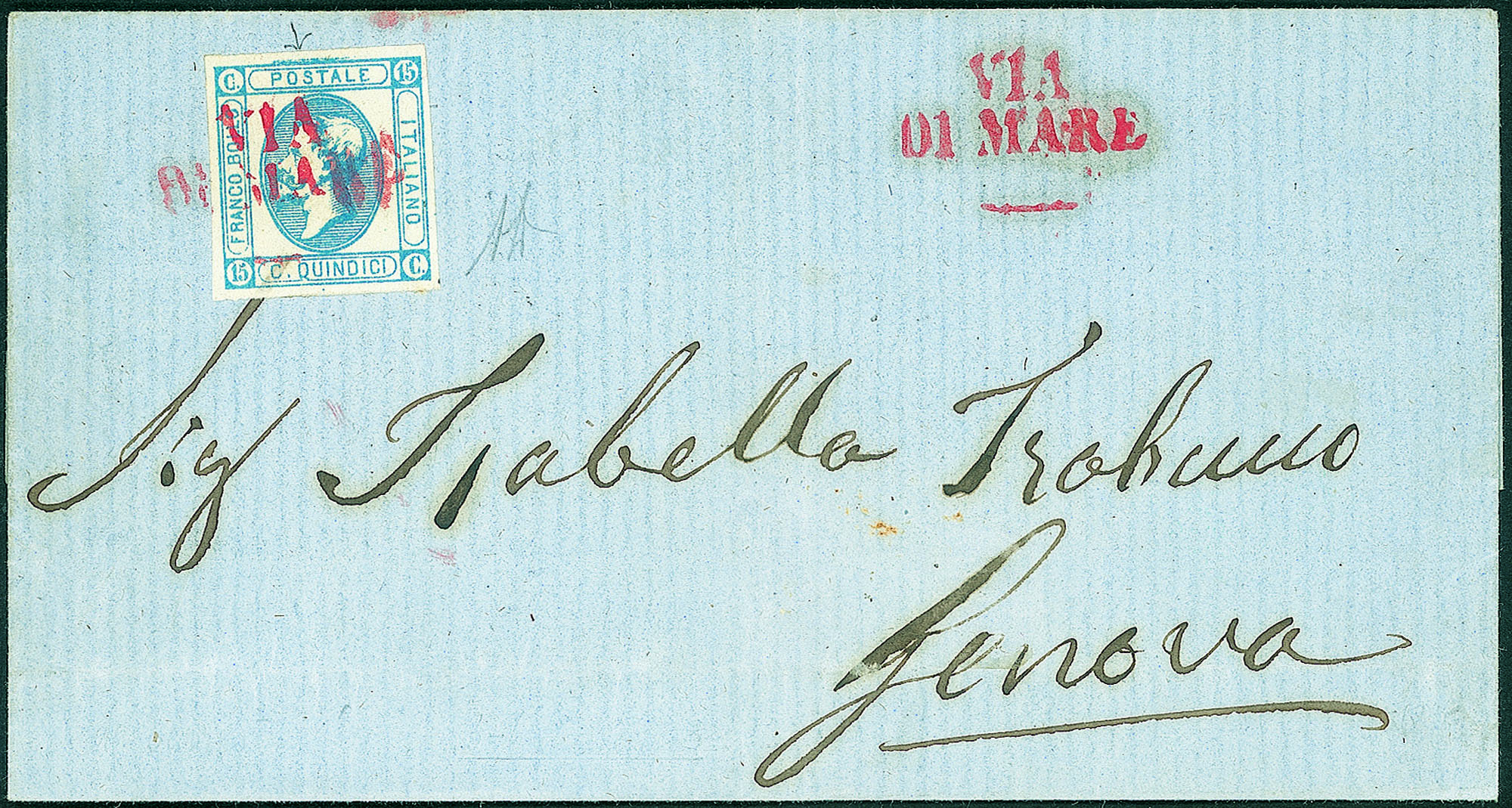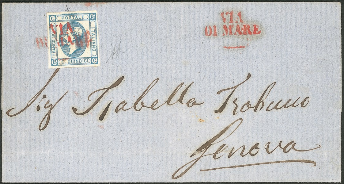 Con 15 cent. litografico (Sass. 13) annullato VIA DI MARE su due righe in rosso (p.5)