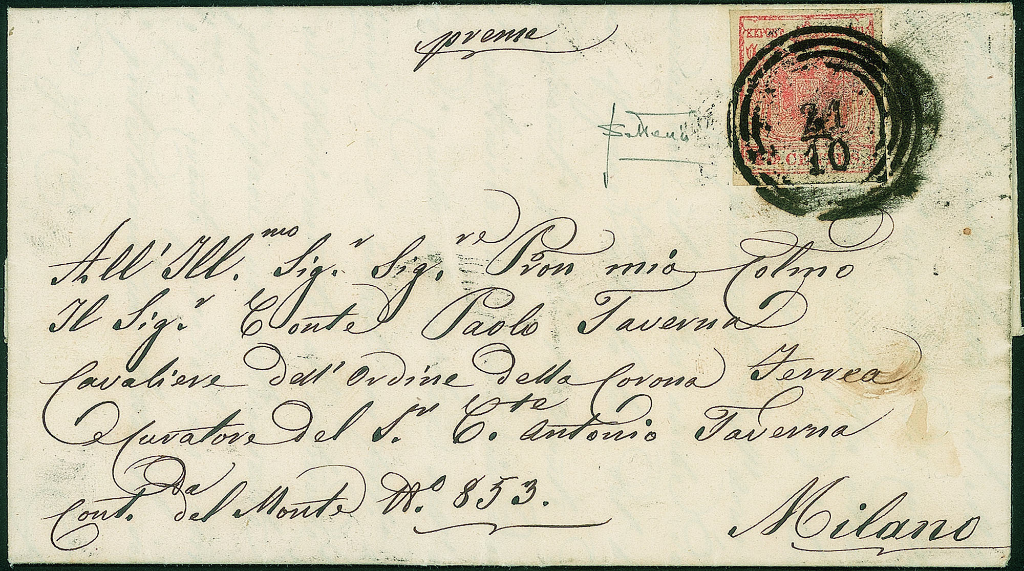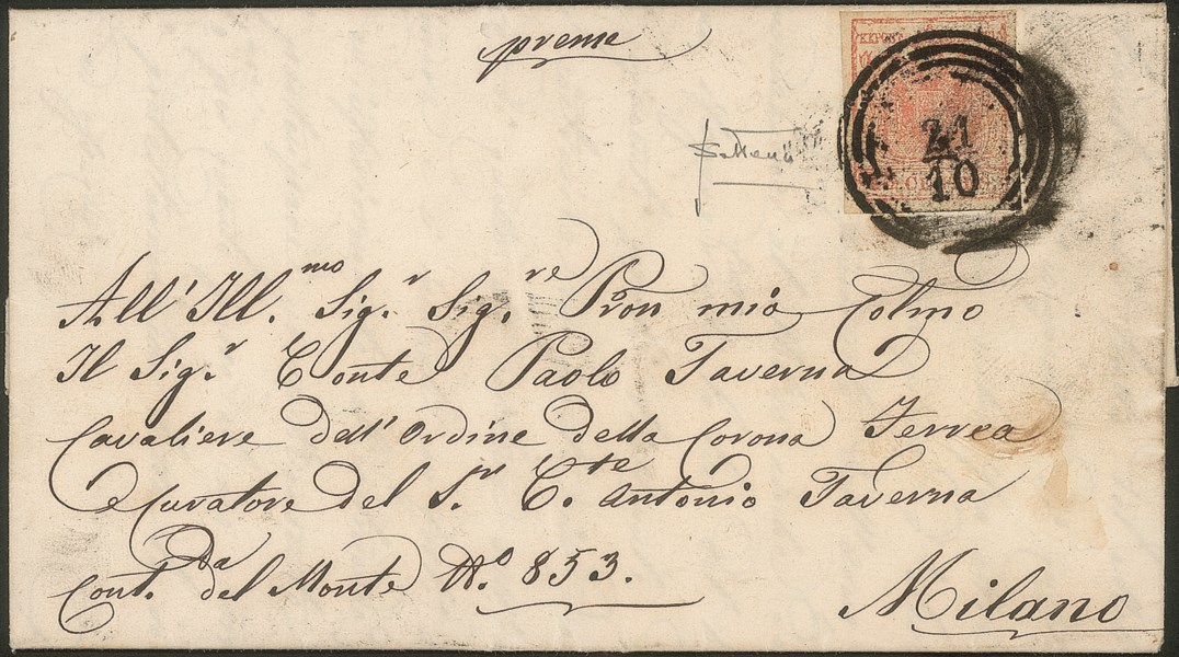 Lettera del 21.10.1852 per Milano affrancata con 15 cent carta a mano terzo tipo (6) - firma Sottoriva