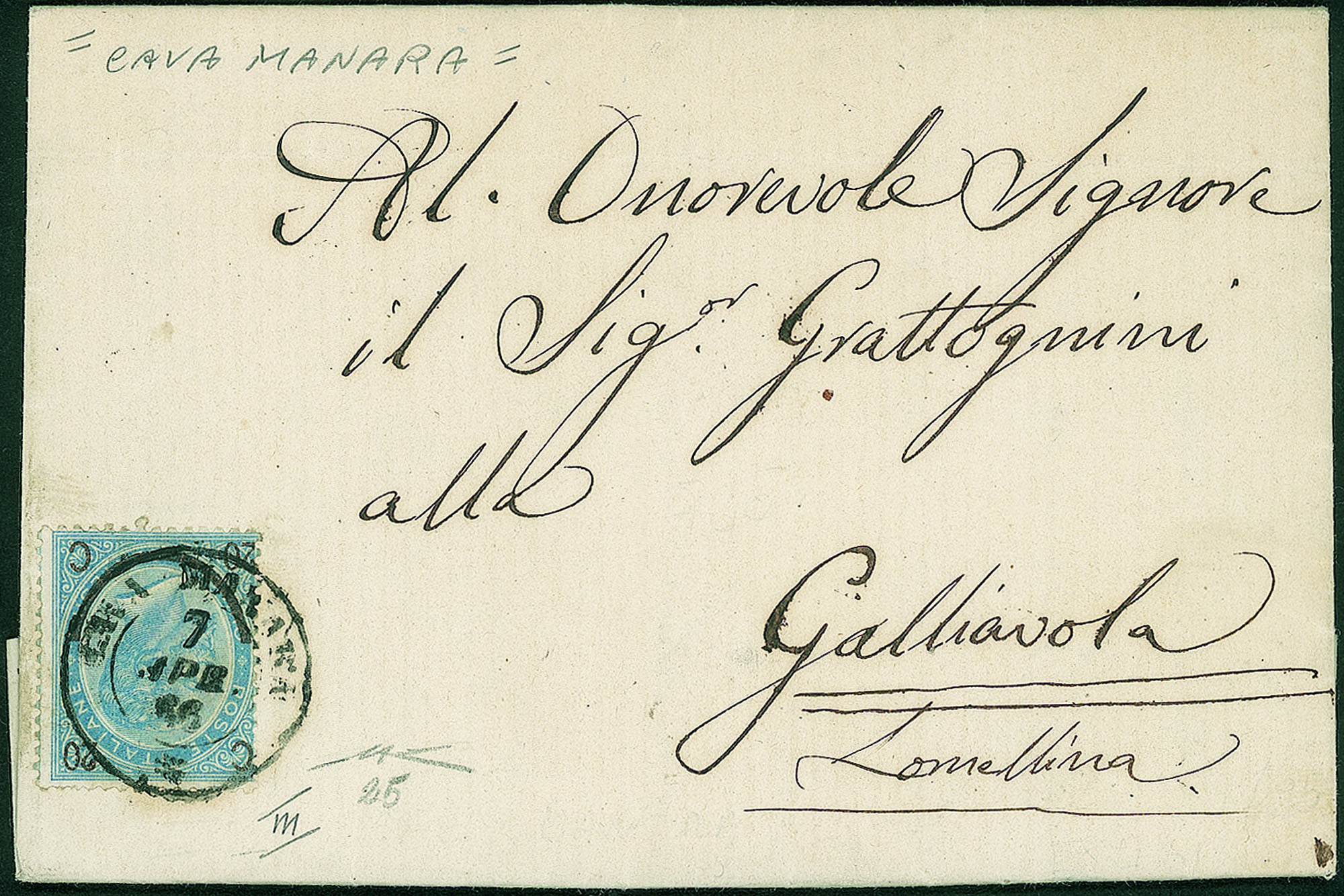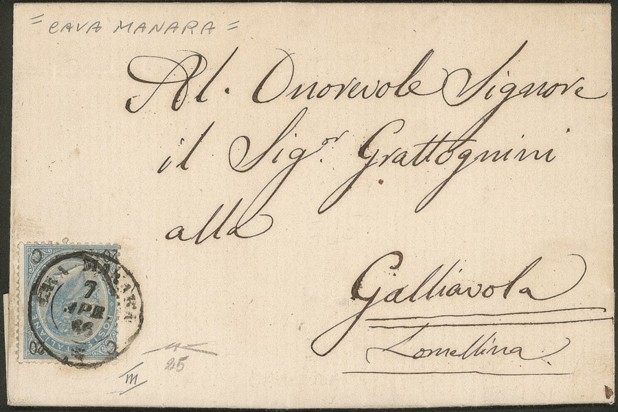Del 7 aprile 1866. Annullo doppio cerchio con rosetta. Cava Manara non è censito o catalogato. Valutazione e stima come R2 su scala Lomb. Veneto fino R5. Cert. Manzoni
