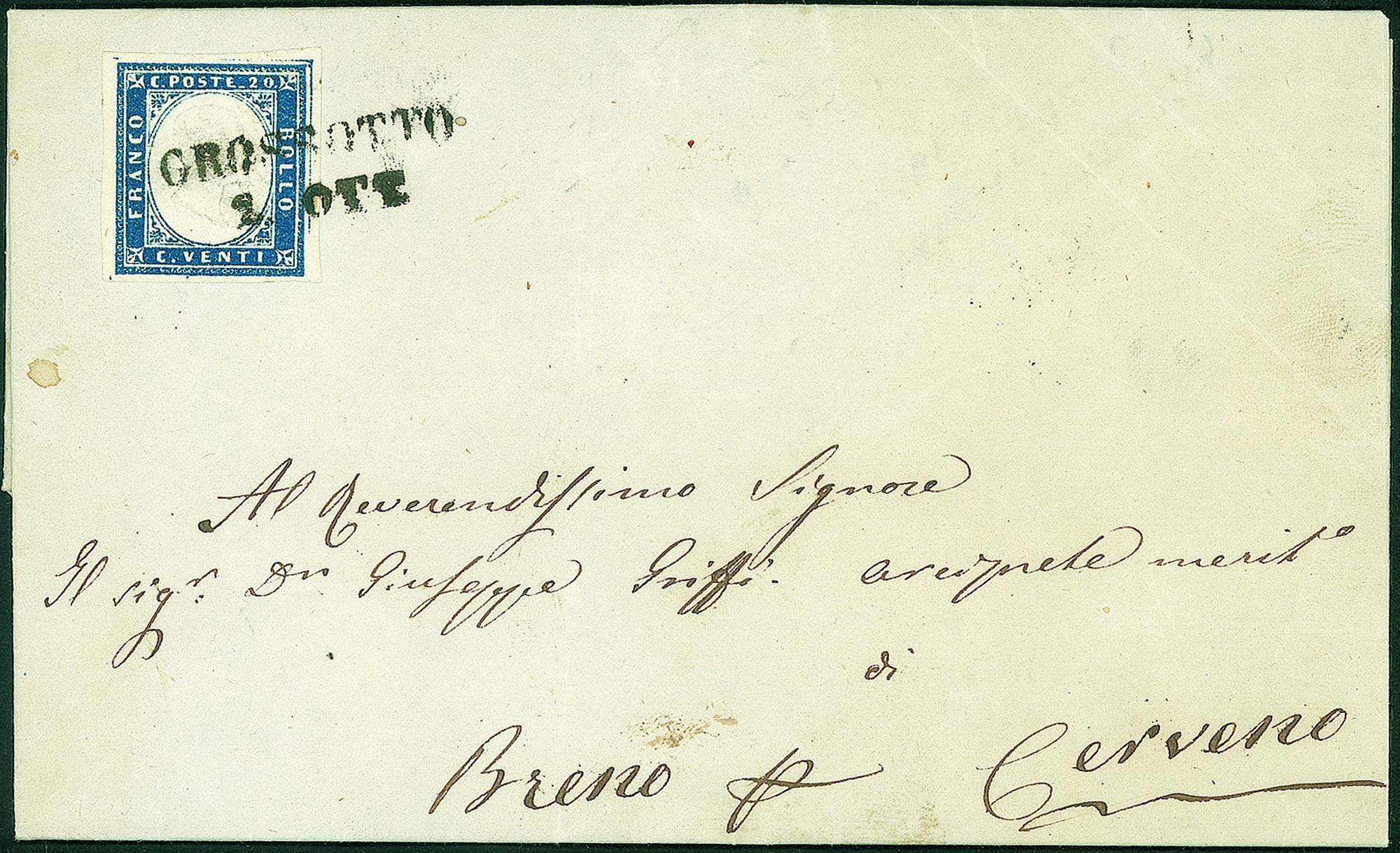Lettera del 2.10.1859 per Cerveno affrancata con 20 cent IV di Sardegna (15B)