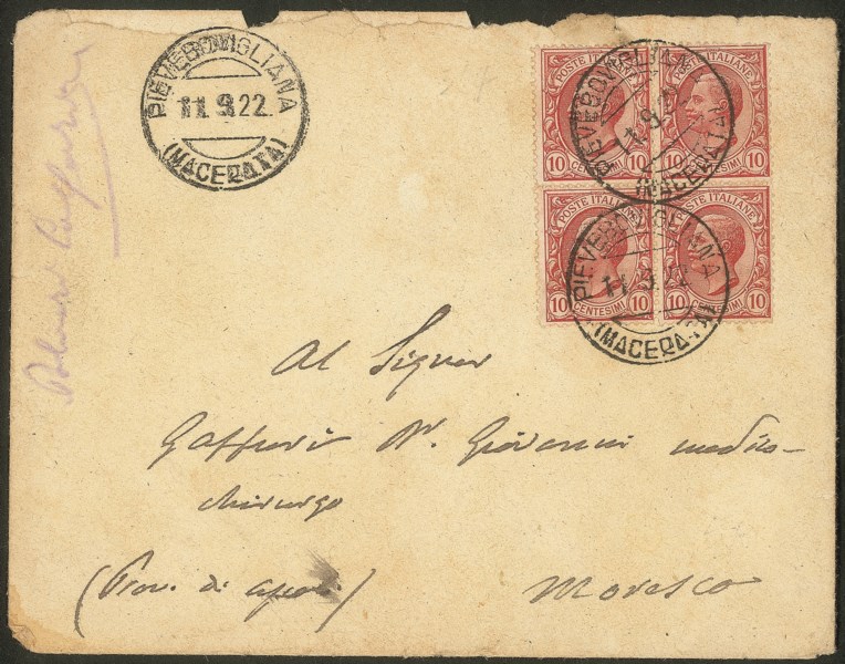 Regno - Vittorio Emanuele III - Busta viaggiata affrancata con quartina del 10 cent (82)