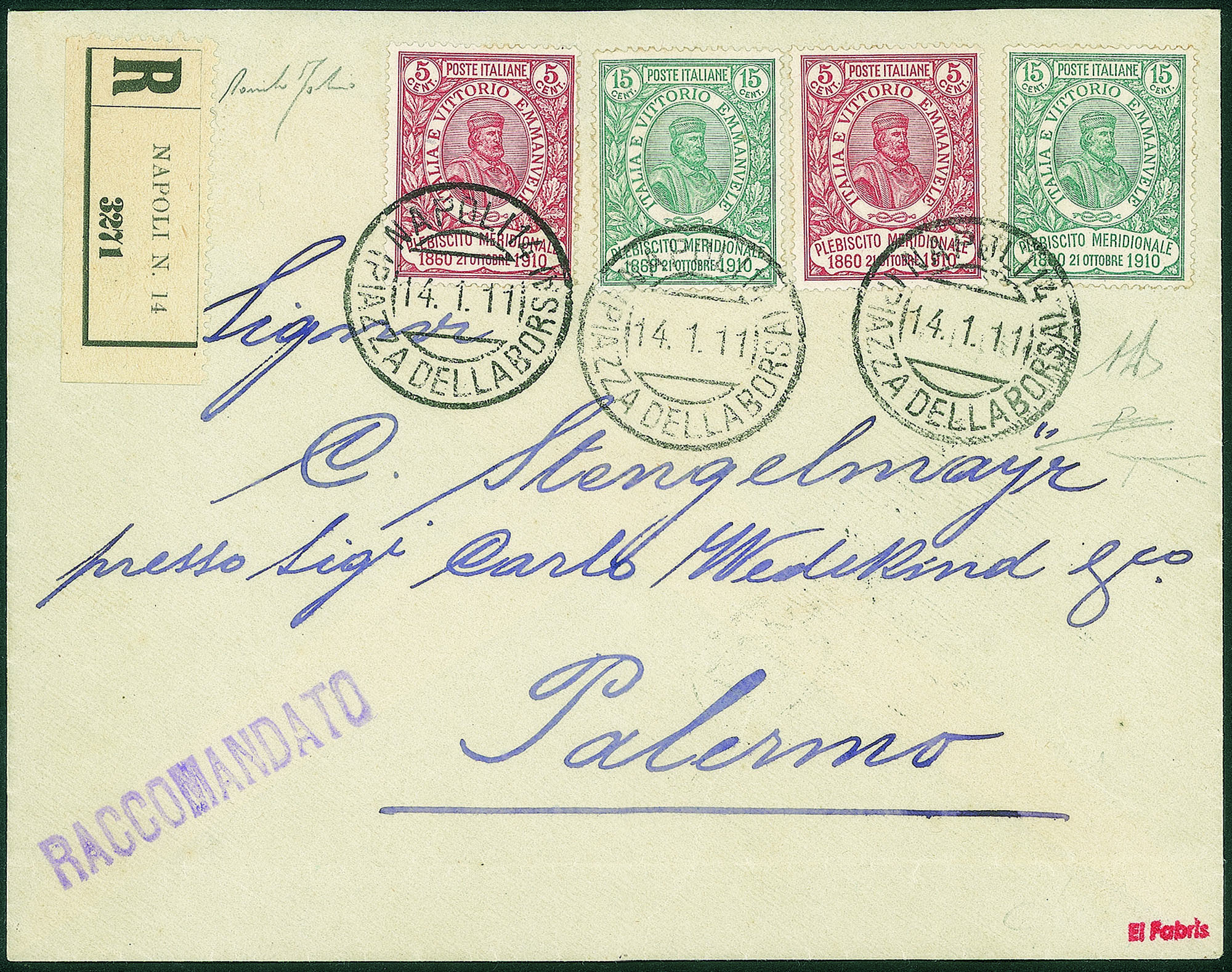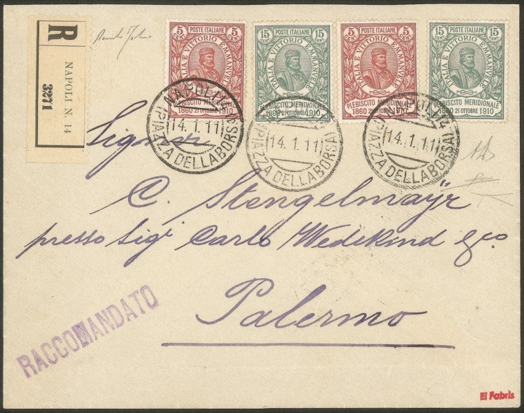 Da Napoli a Palermo del 14.1.11 - ottimo stato di conservazione con annulli nitidi e francobolli perfetti - Fabris + cert. E. Diena + cert. Bottacchi