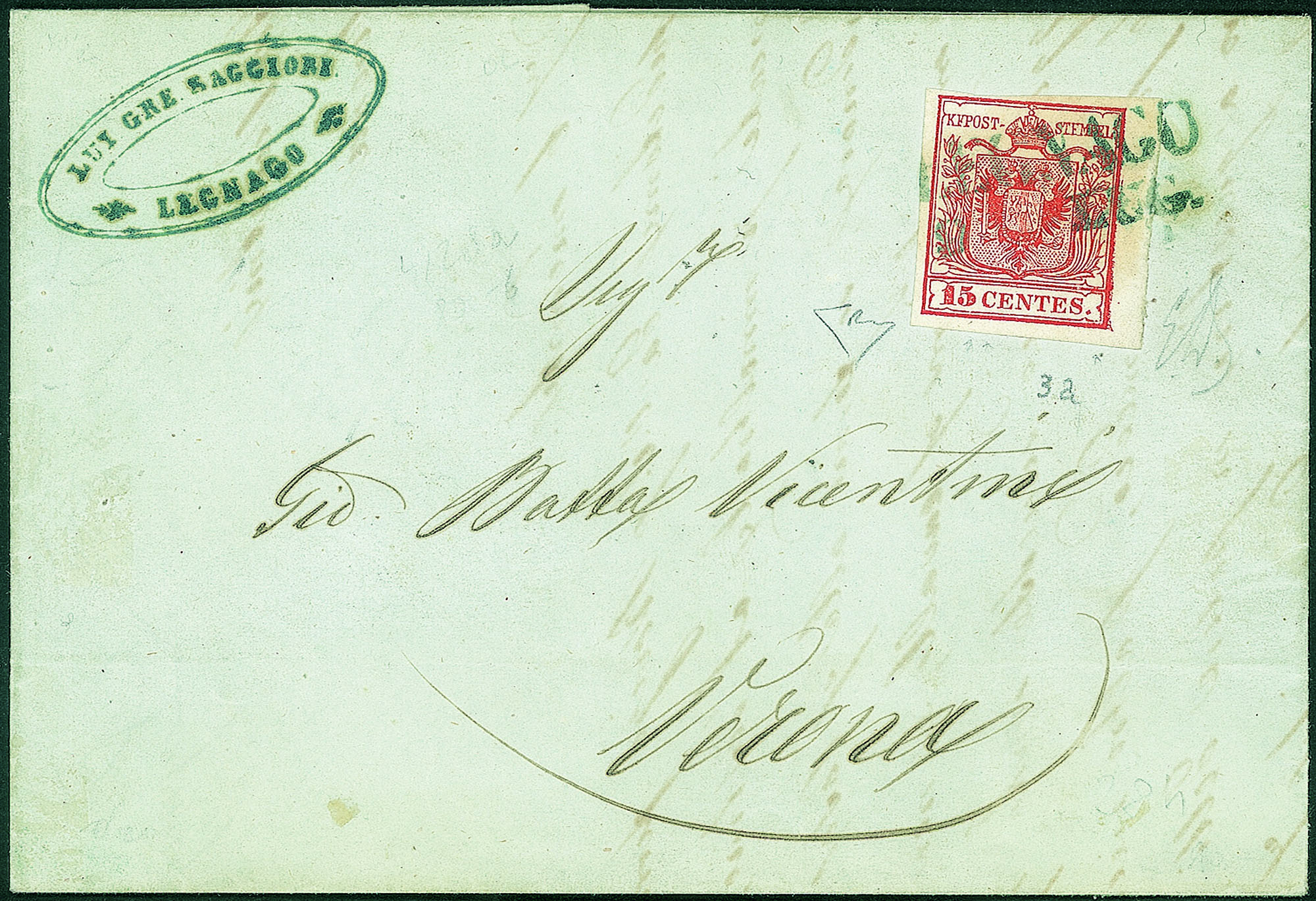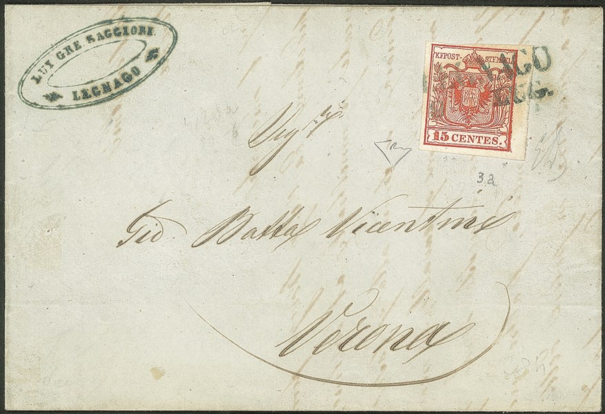 15 cent (3a) bordo foglio - lettera per Verona del 9.7.1850 - Emilio Diena + cert. En. Diena