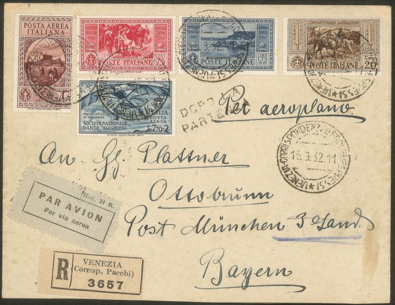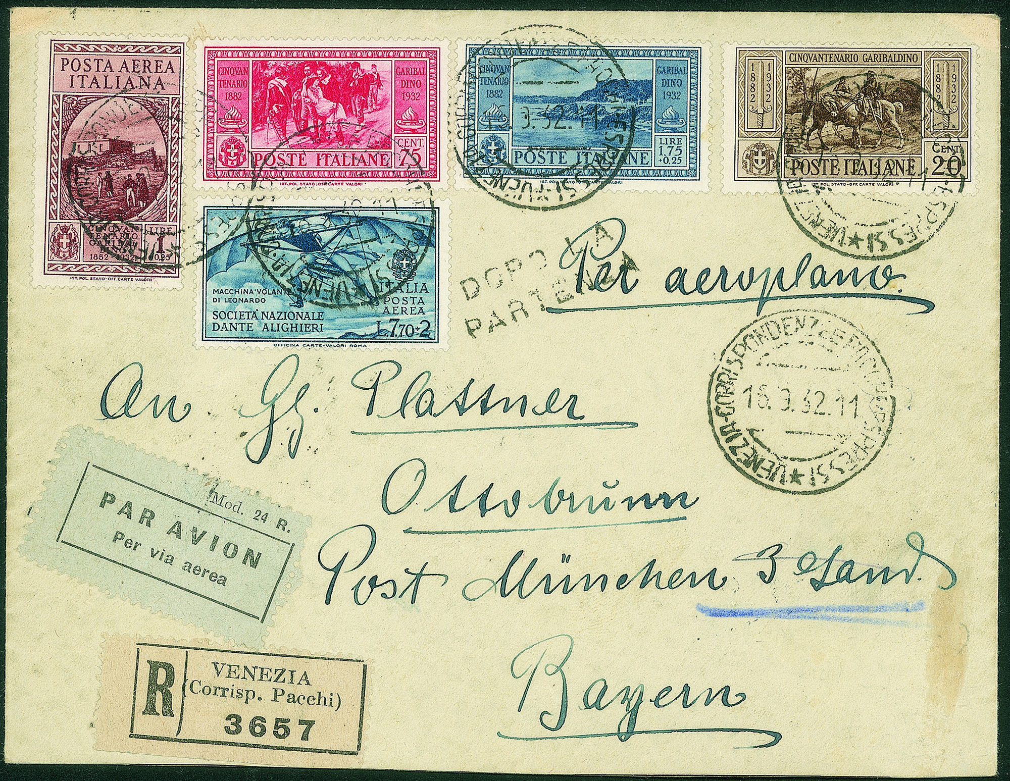 + 2 lire (30) + Garibaldi 20 cent + 75 cent + 1,75 lire e 1 lira Posta Aerea (316 + 320 + 322 + 32) su aerogramma raccomandato da Venezia a Monaco del 16.9.32 - splendido