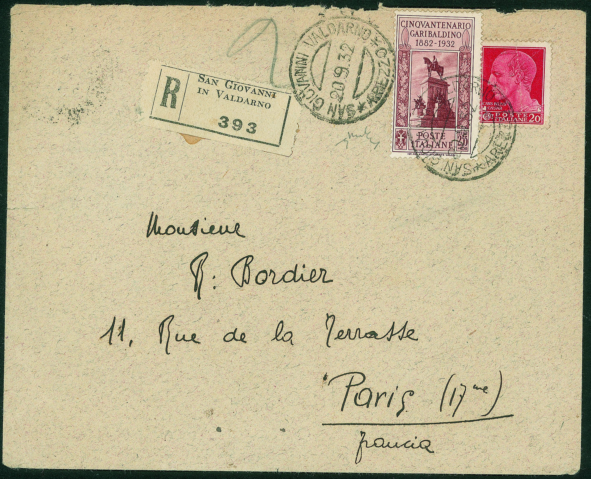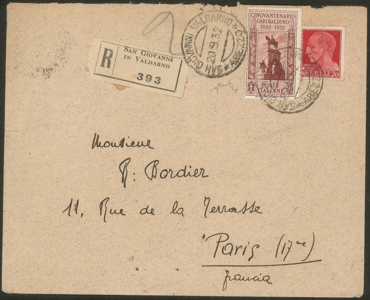 + complementare (247) su raccomandata da S. Giovanni Valdarno a Parigi del 20.9.32 - in tariffa - molto rara non filatelica - Chiavarello
